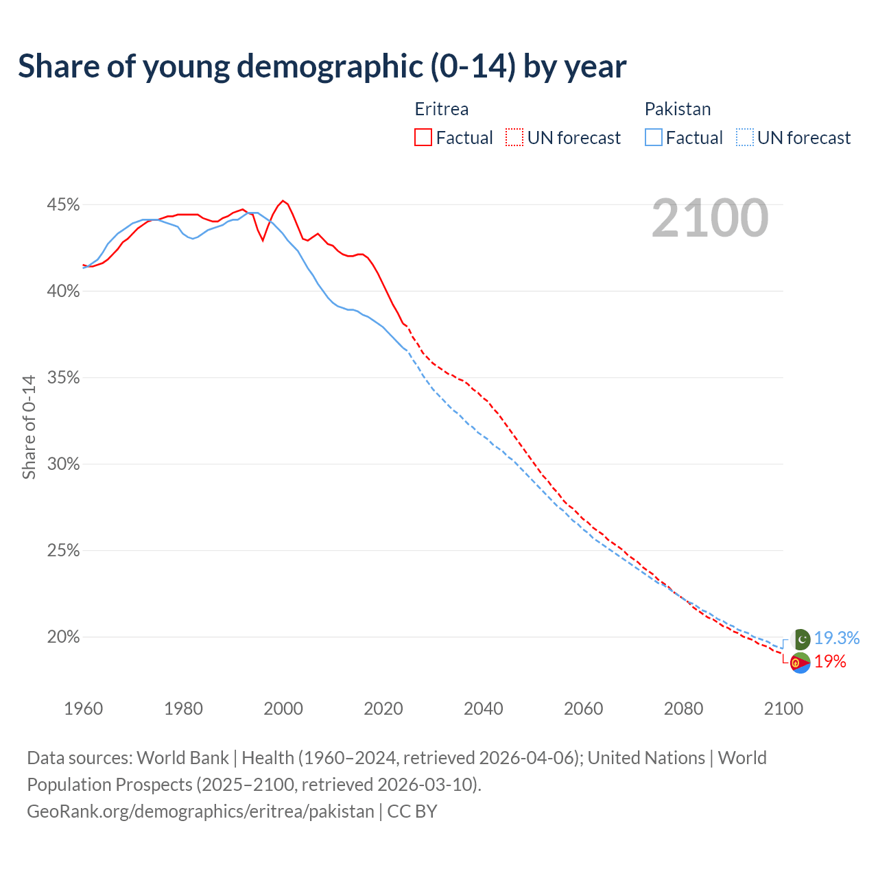 - The share of young demographic (0-15 years old) in Eritrea is 38.1% vs 36.7% in Pakistan.