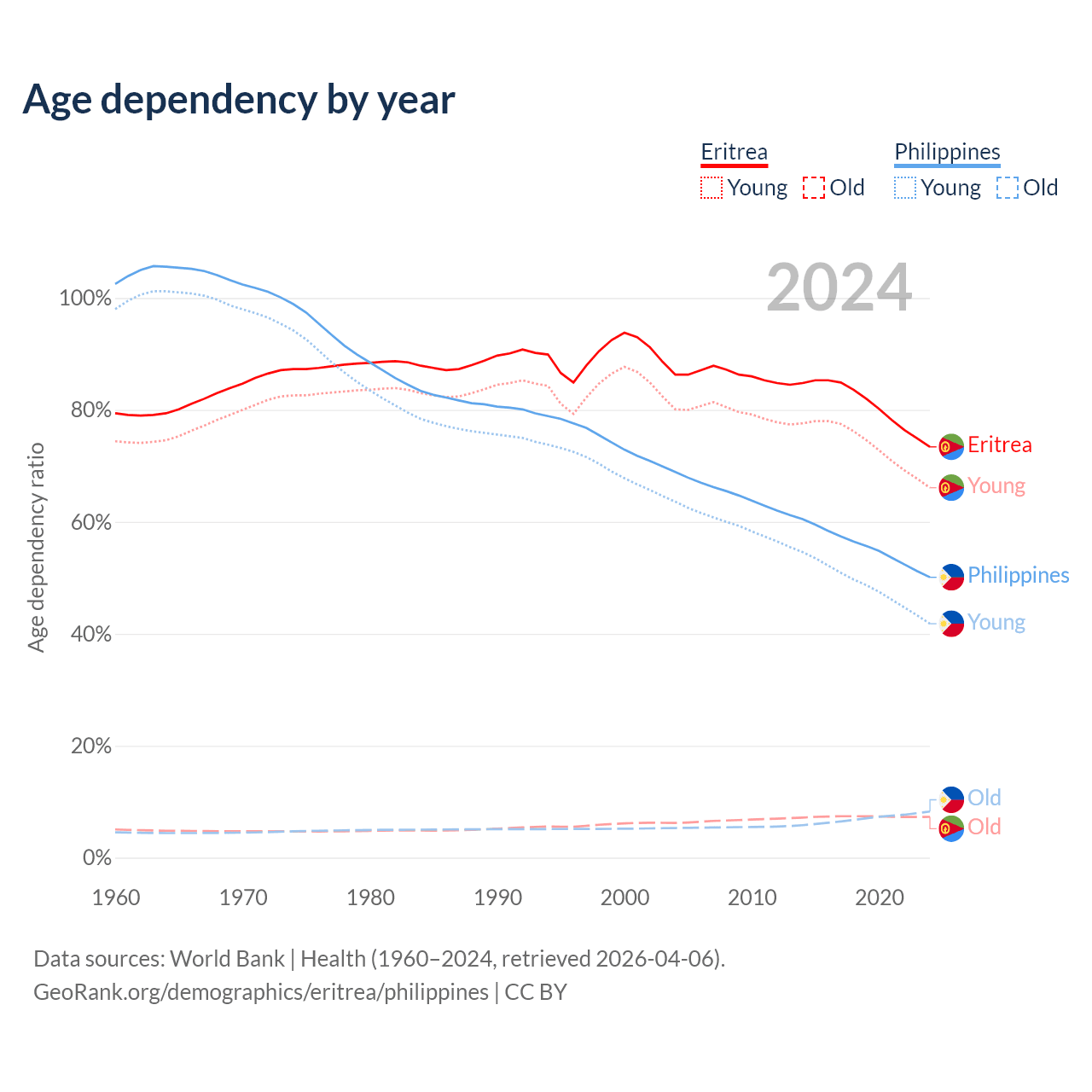 Data sources: World Bank | Health (1960–2024, retrieved 2026-04-06); U.S. Census Bureau (1960–2024, retrieved 2026-02-08).