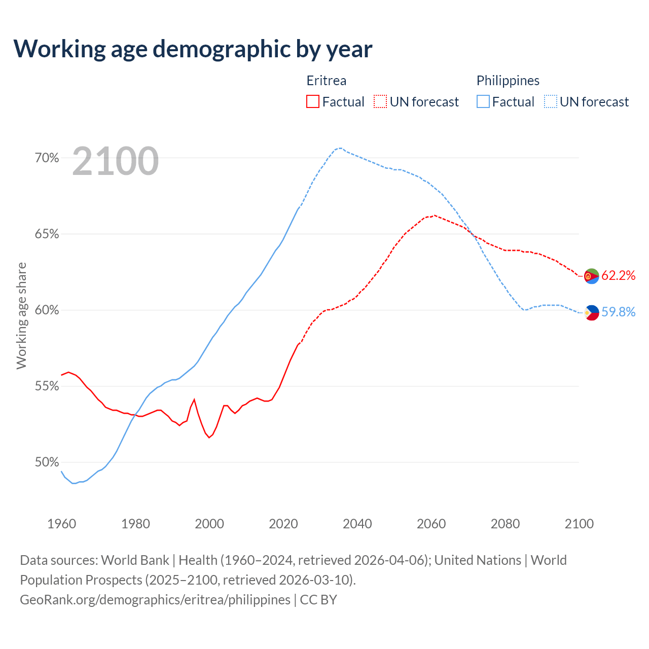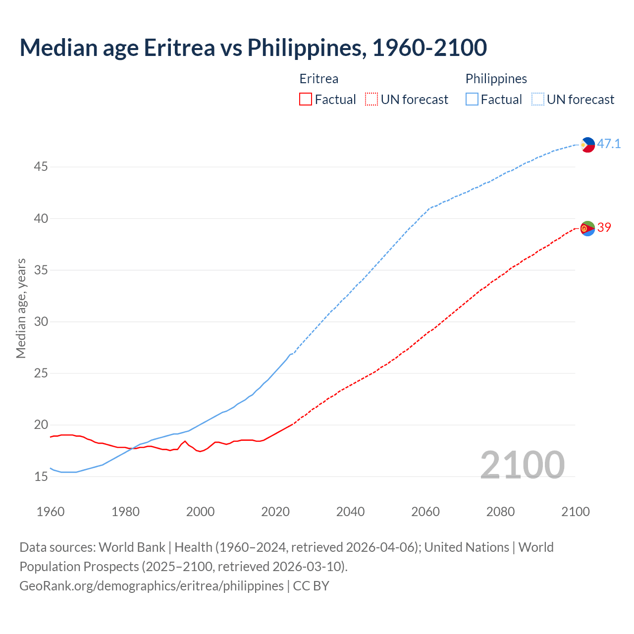 Median age Eritrea vs Philippines, 1960-2100