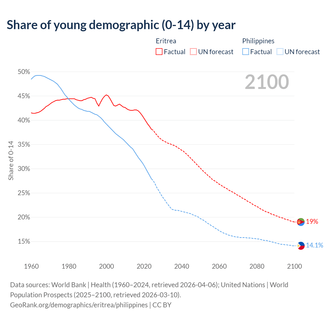 - The share of young demographic (0-15 years old) in Eritrea is 38.1% vs 27.9% in the Philippines.