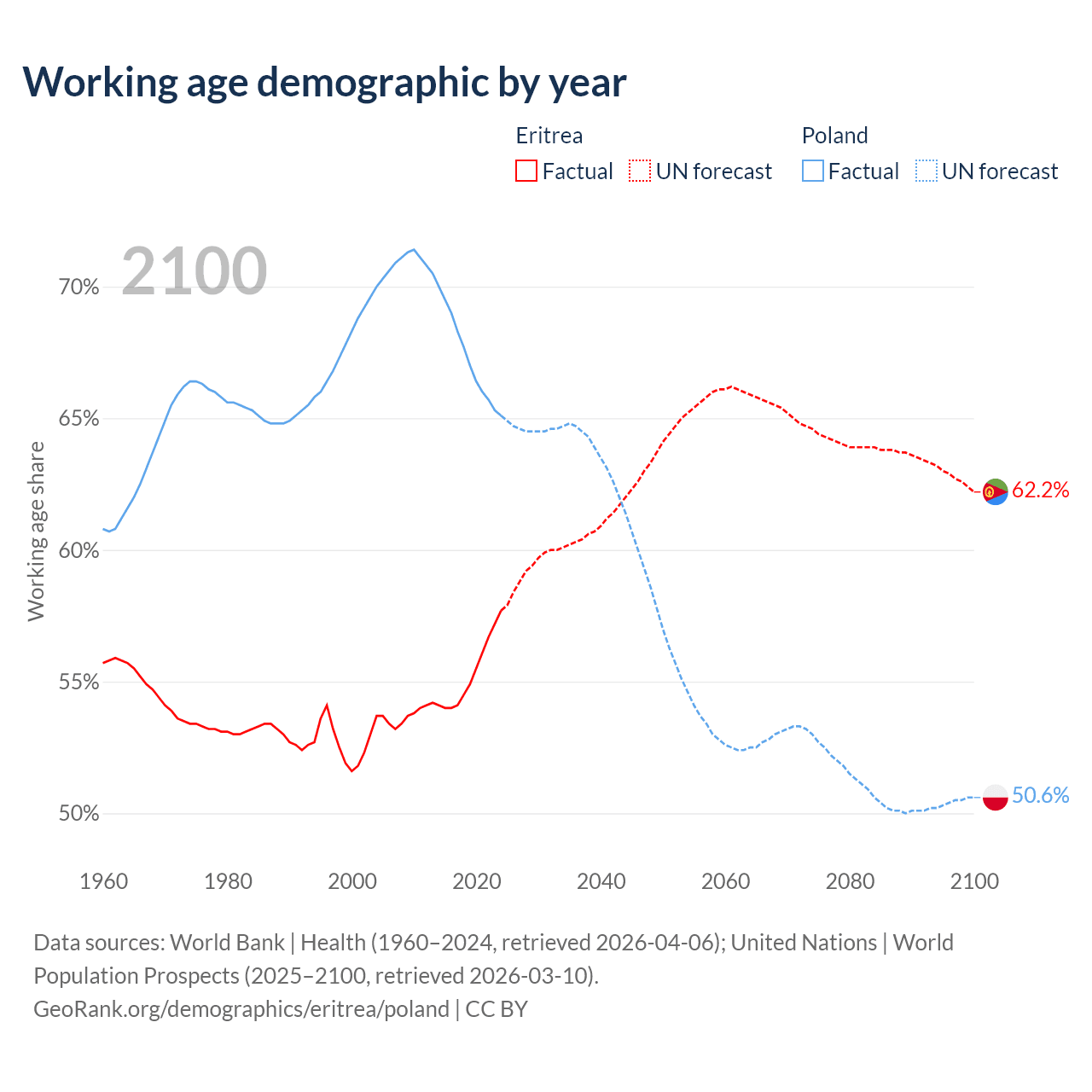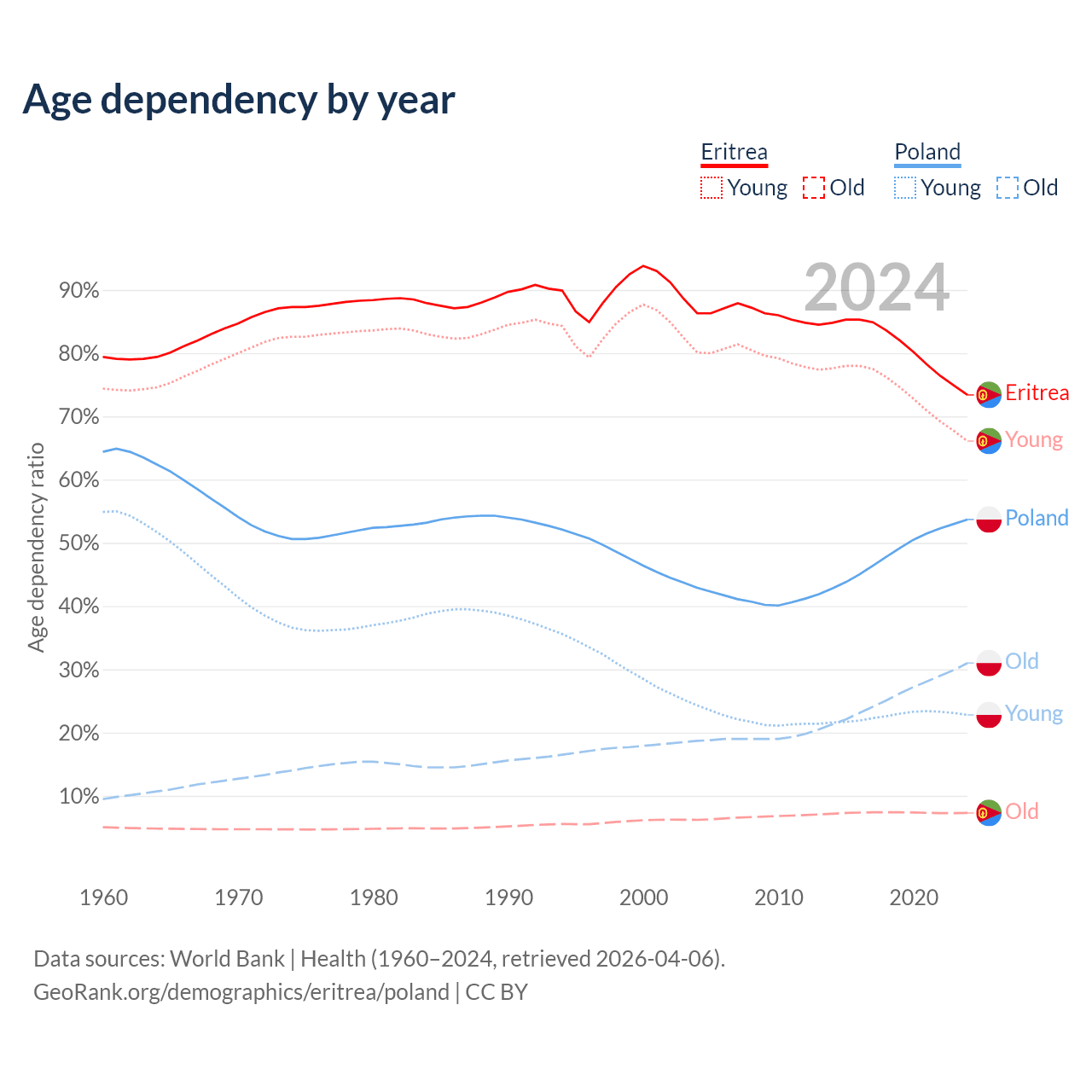 The share of older people aged 65 and over is 4.2% in Eritrea and 20.1% in Poland. Life expectancy in Eritrea compared to Poland .