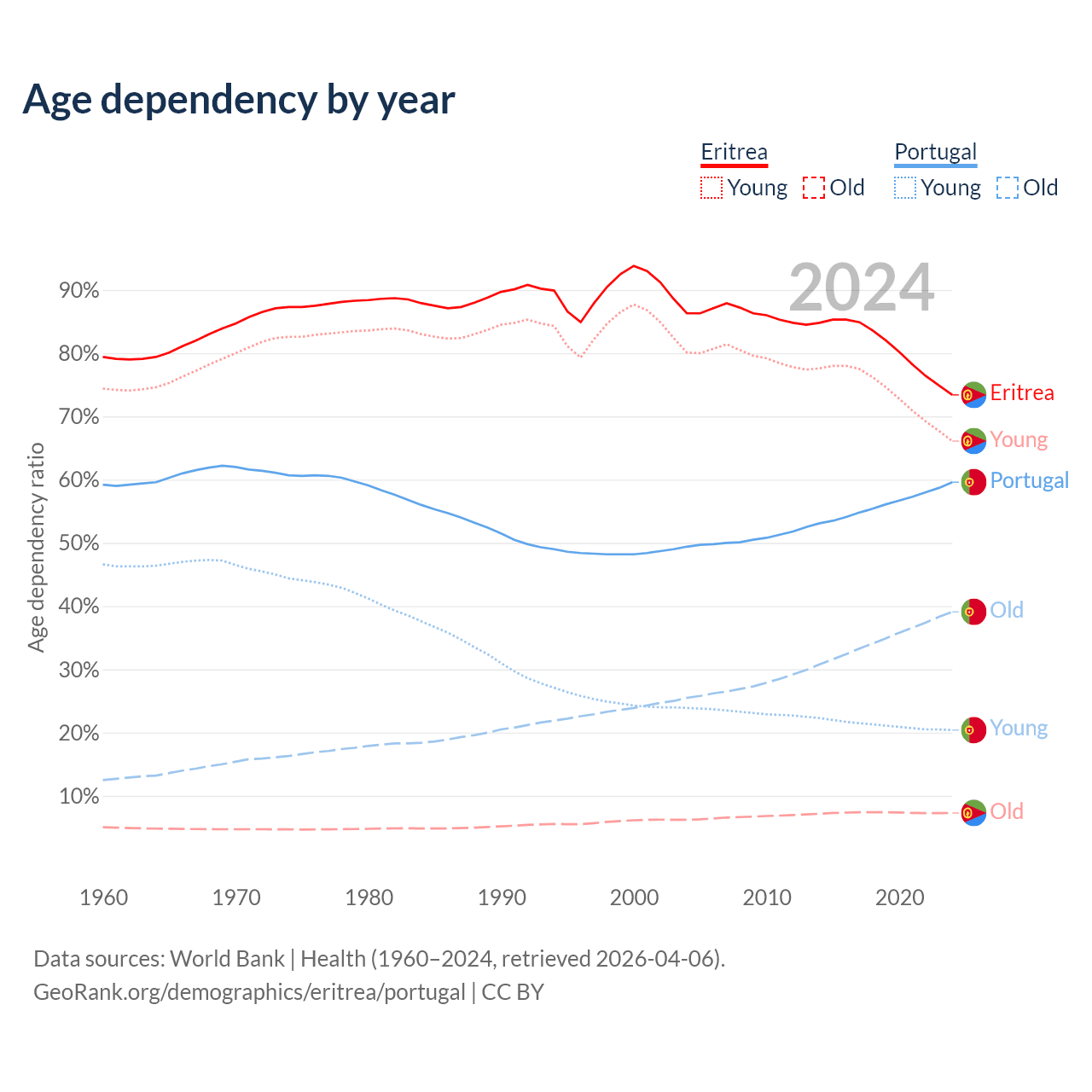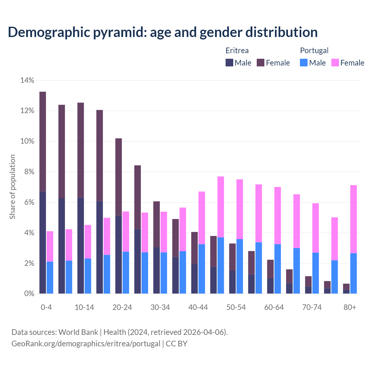 The share of older people aged 65 and over is 4.2% in Eritrea and 24.5% in Portugal. Life expectancy in Eritrea compared to Portugal .