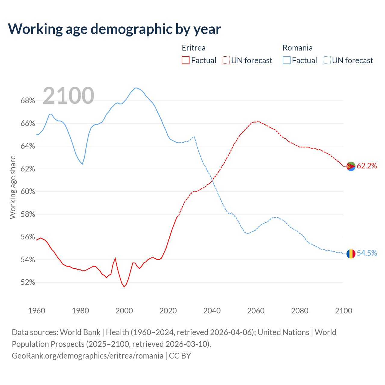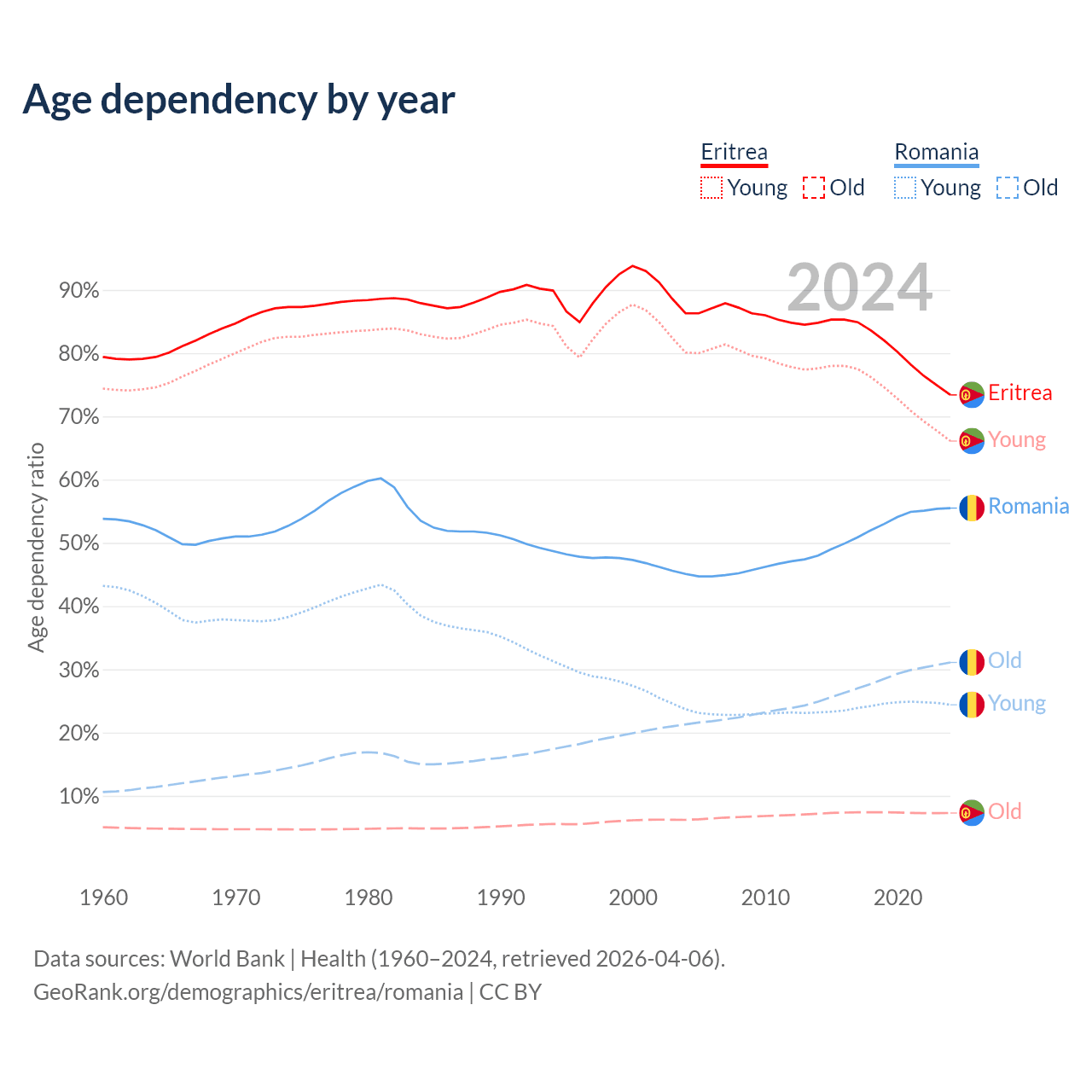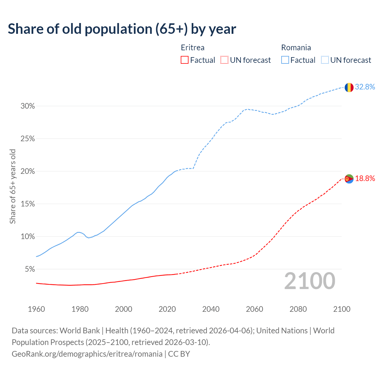 The share of older people aged 65 and over is 4.2% in Eritrea and 20% in Romania. Life expectancy in Eritrea compared to Romania .