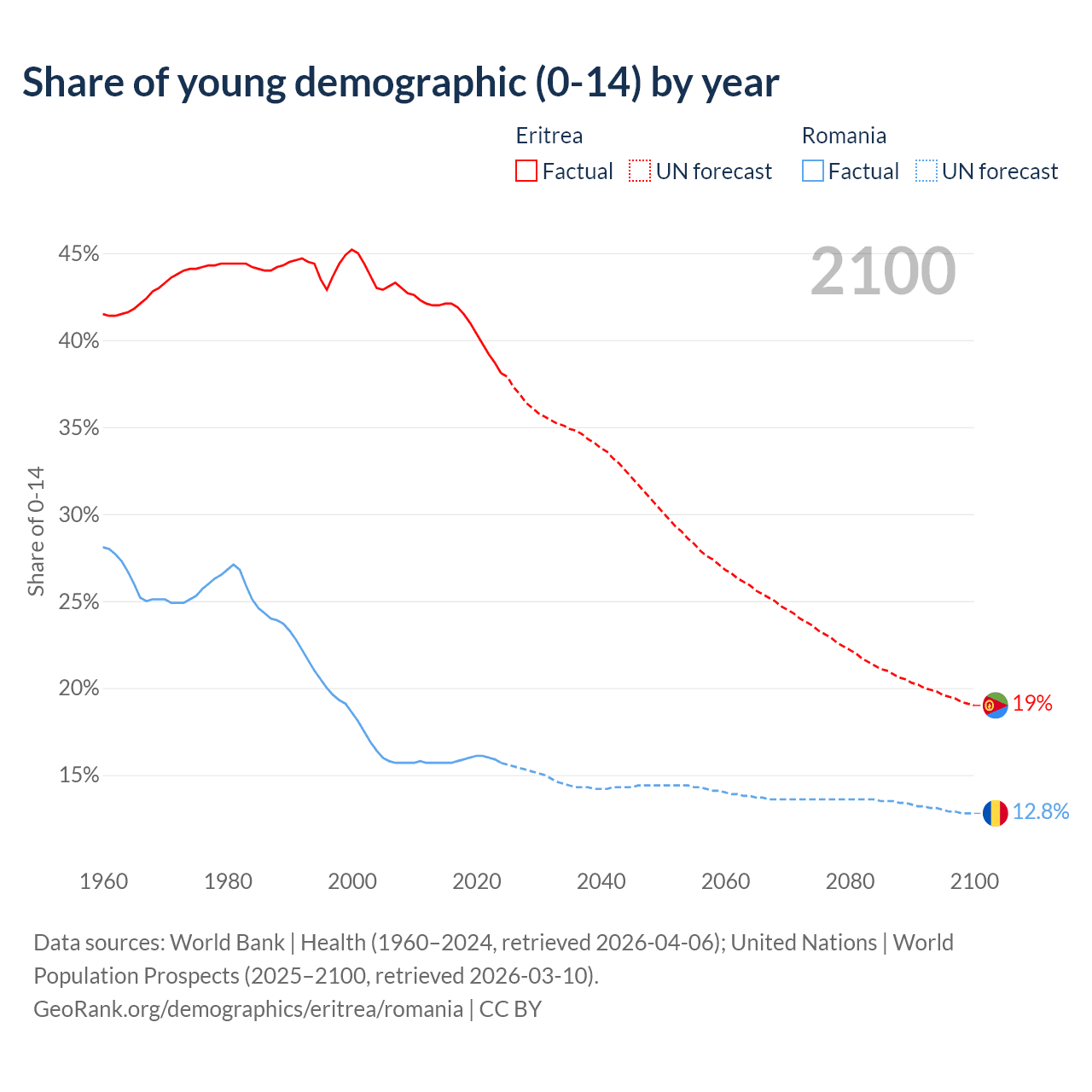 - The share of young demographic (0-15 years old) in Eritrea is 38.1% vs 15.7% in Romania.