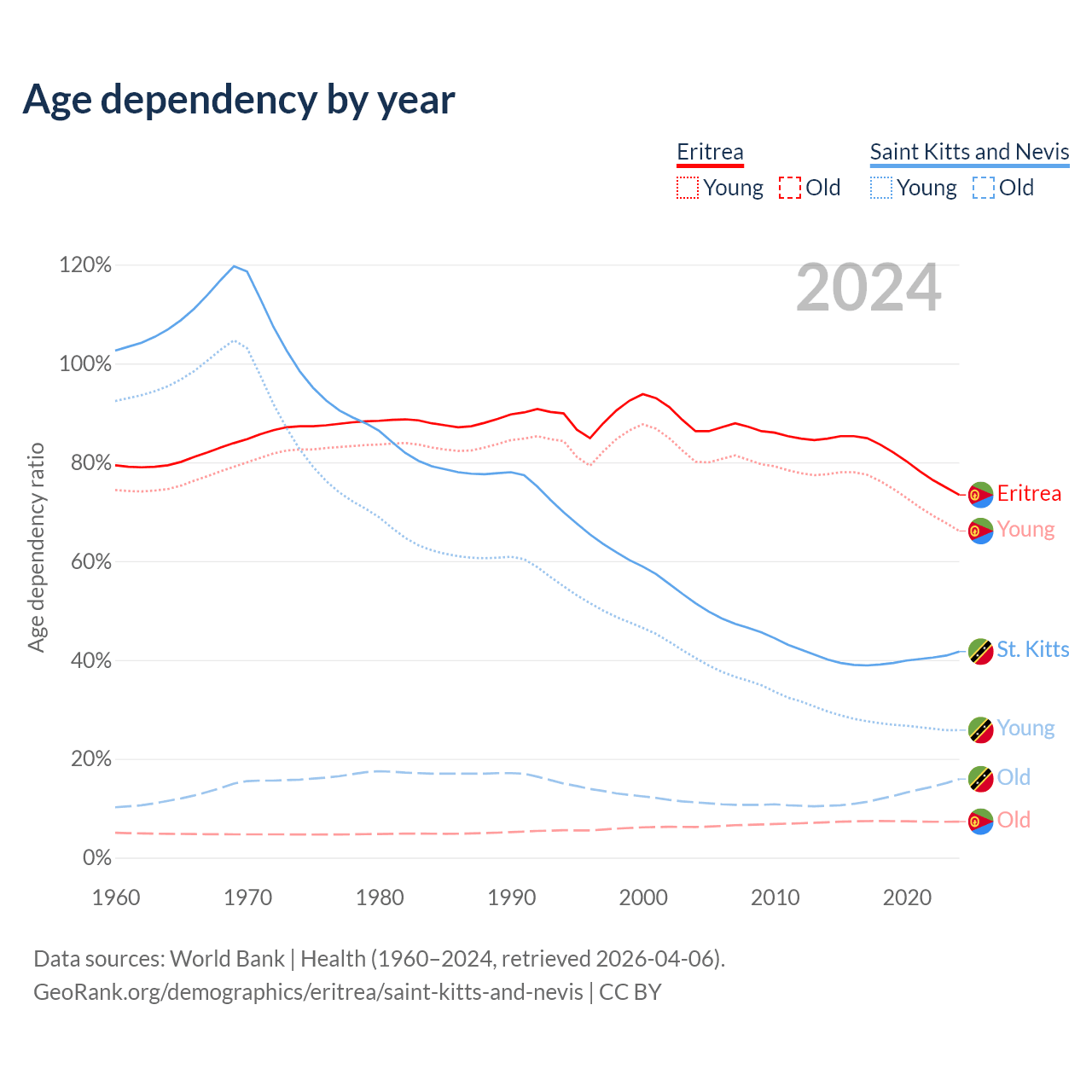 The share of older people aged 65 and over is 4.2% in Eritrea and 11.2% in Saint Kitts and Nevis. Life expectancy in Eritrea compared to Saint Kitts and Nevis .