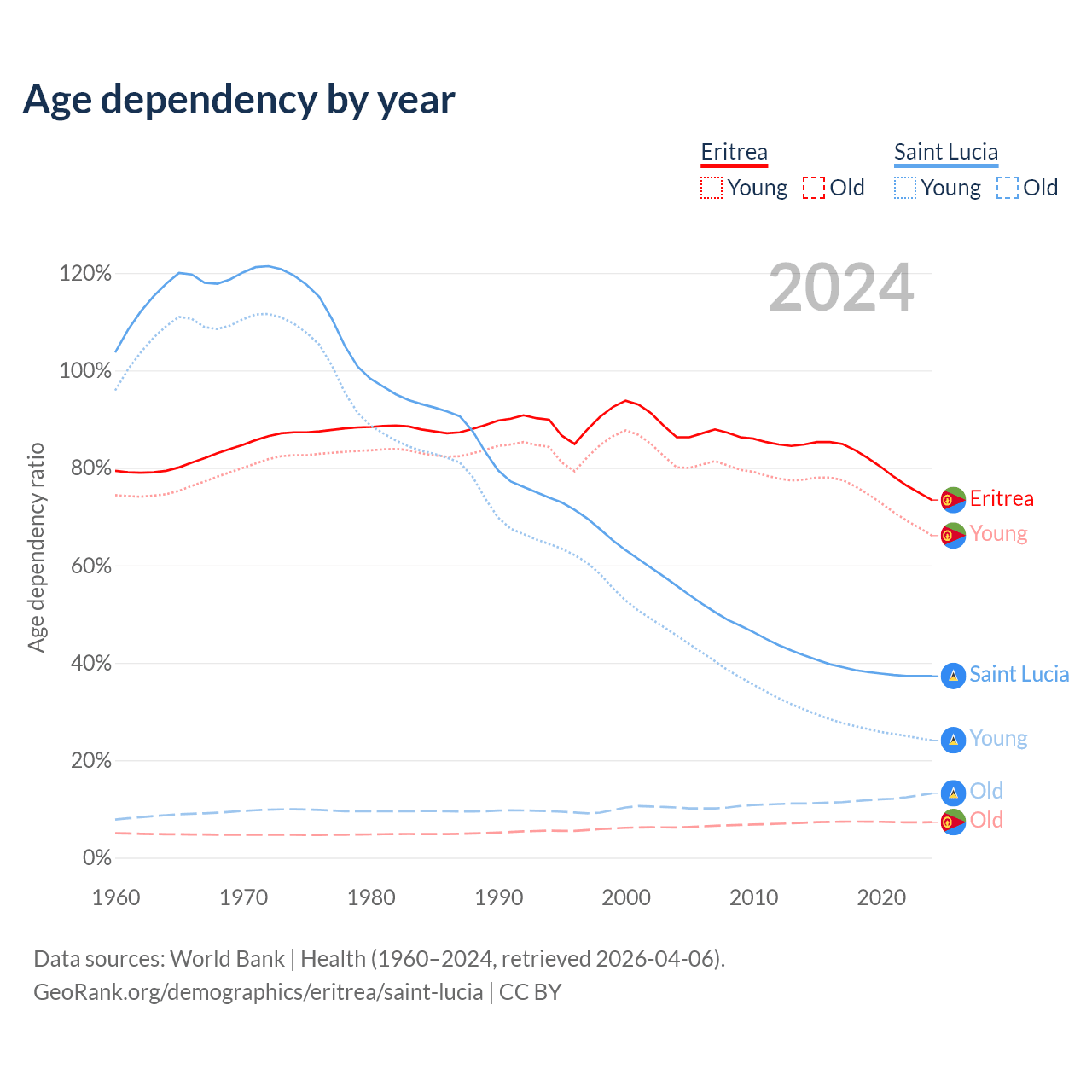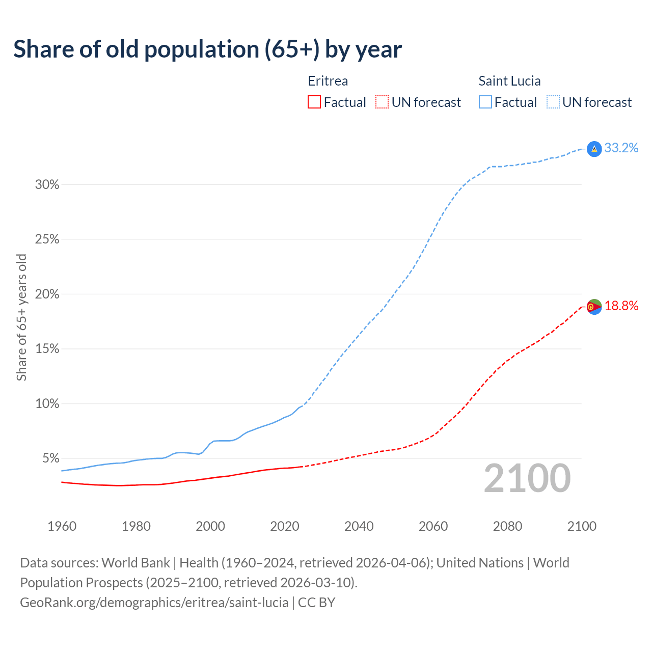 - The share of old-age demographic (65+) in Eritrea is 4.2% vs 9.62% in Saint Lucia.