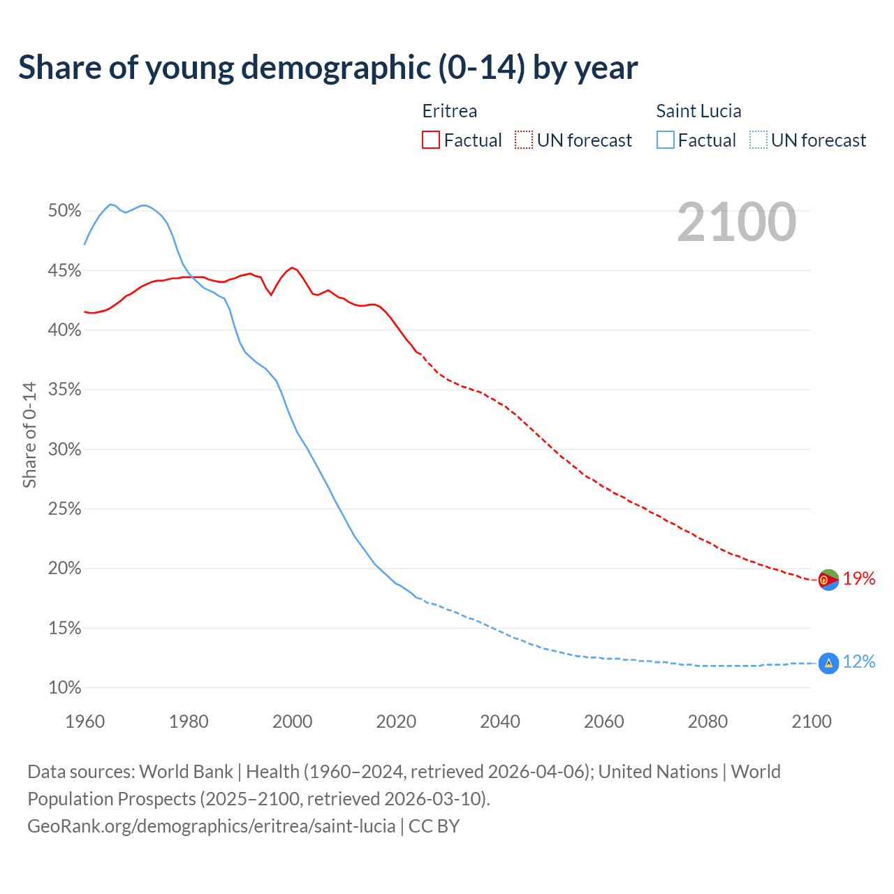 - The share of young demographic (0-15 years old) in Eritrea is 38.1% vs 17.5% in Saint Lucia.