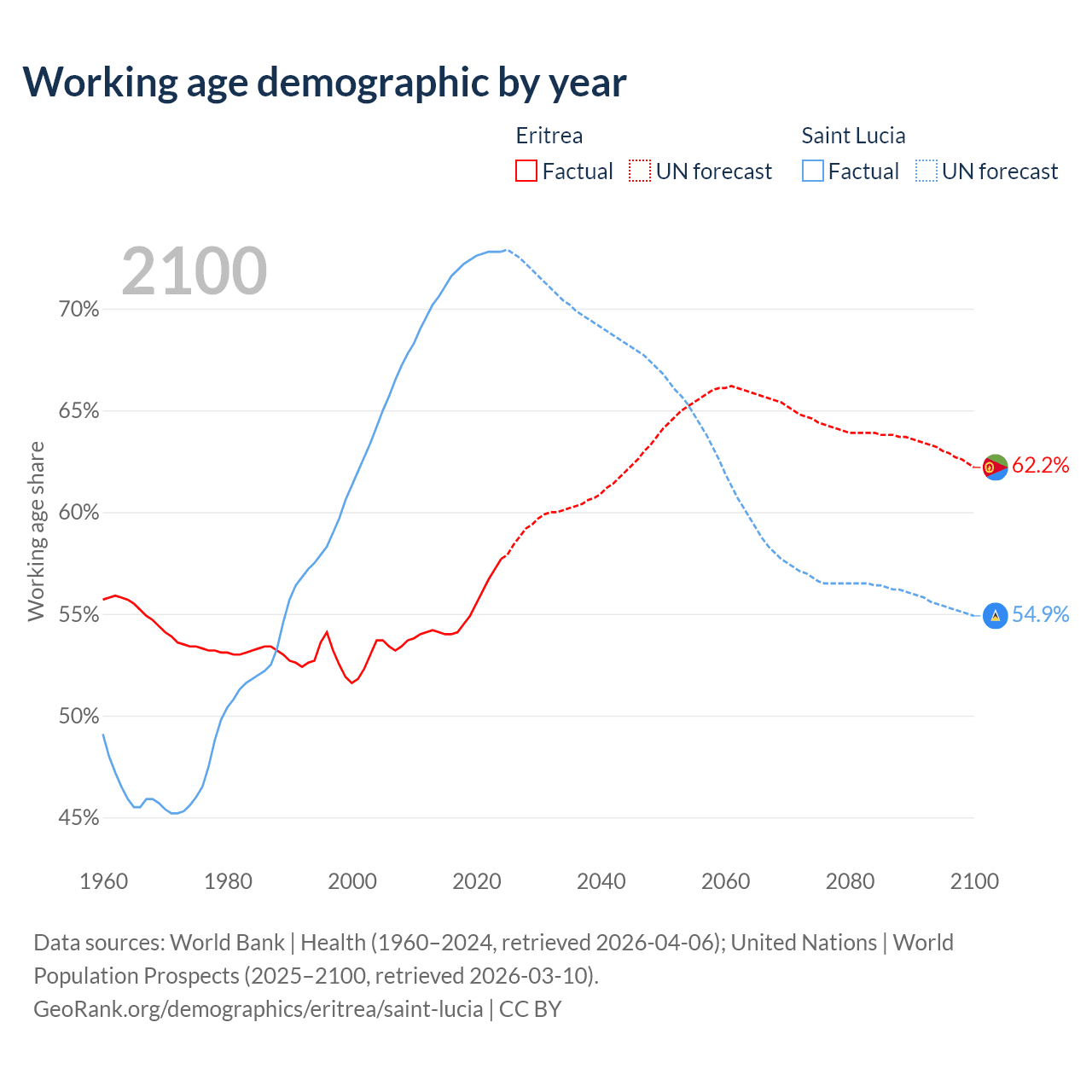 - Eritrea has 2.13M working age adults (aged 15-64) vs 132K in Saint Lucia.