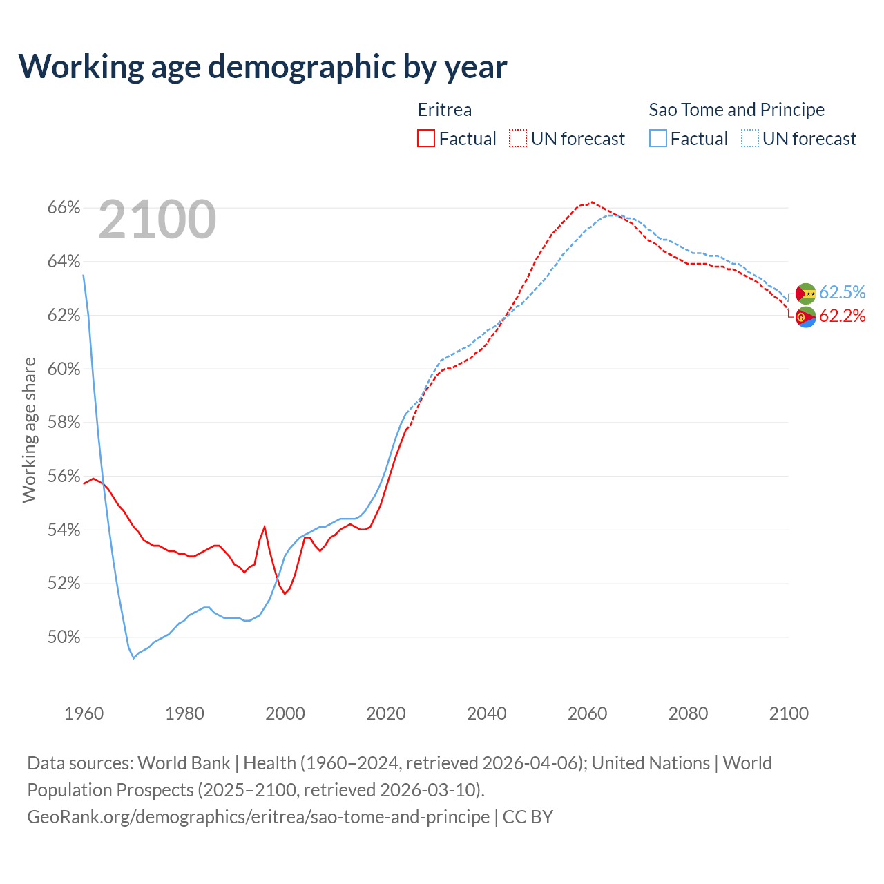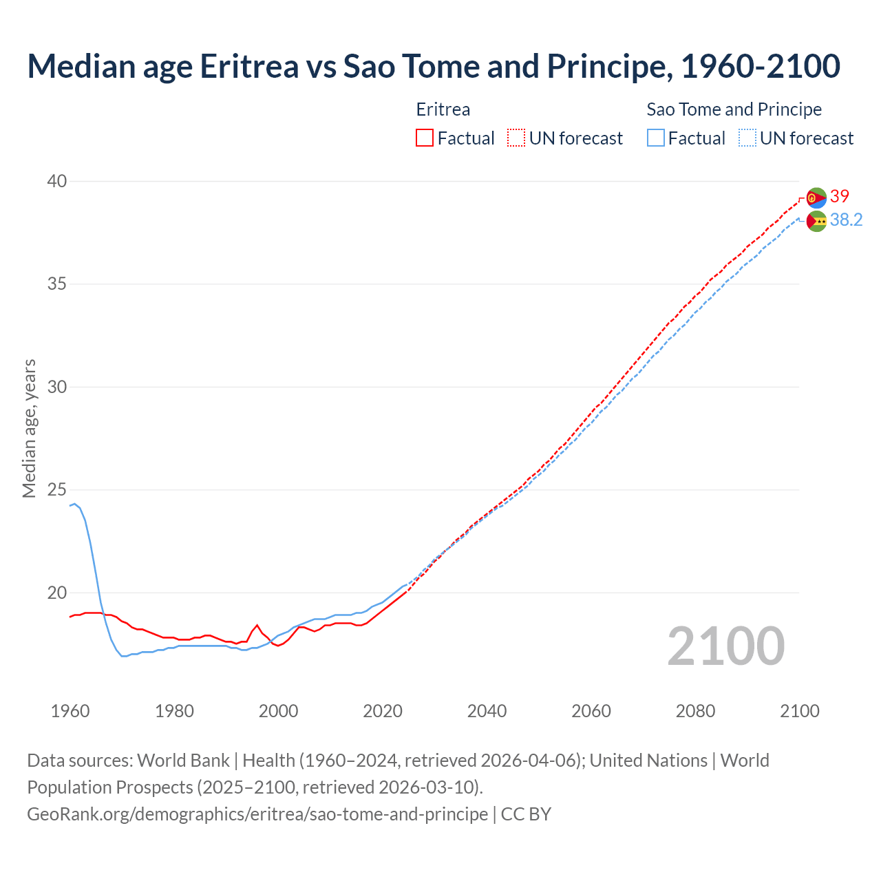 Median age Eritrea vs Sao Tome and Principe, 1960-2100