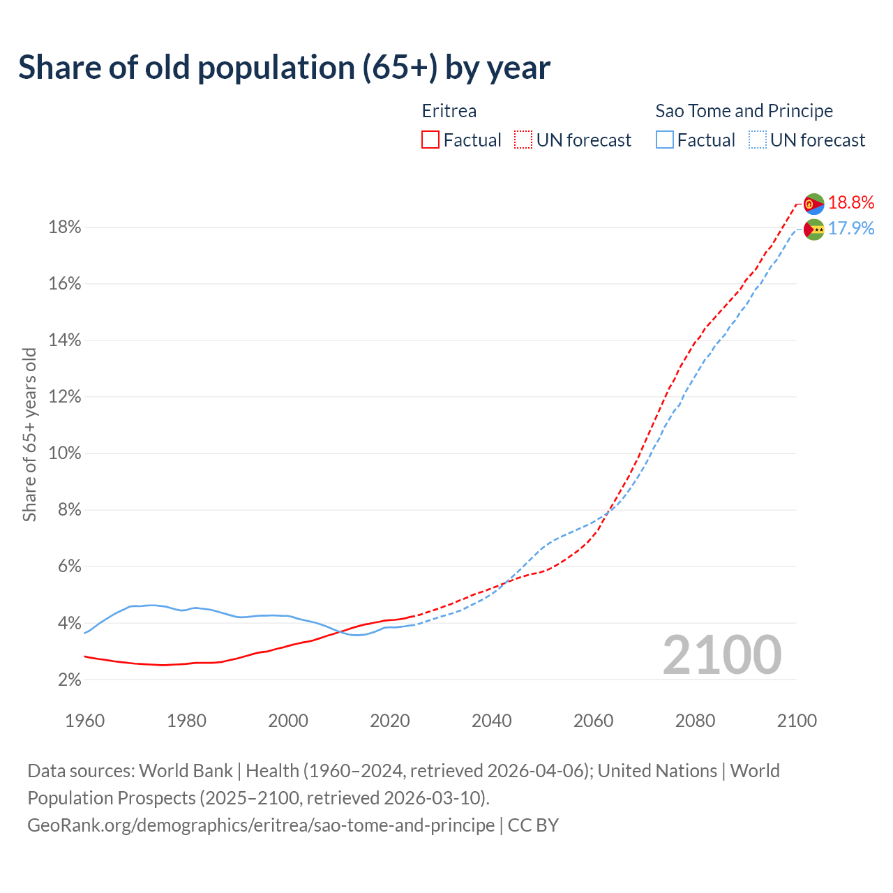 - The share of old-age demographic (65+) in Eritrea is 4.2% vs 3.9% in Sao Tome and Principe.