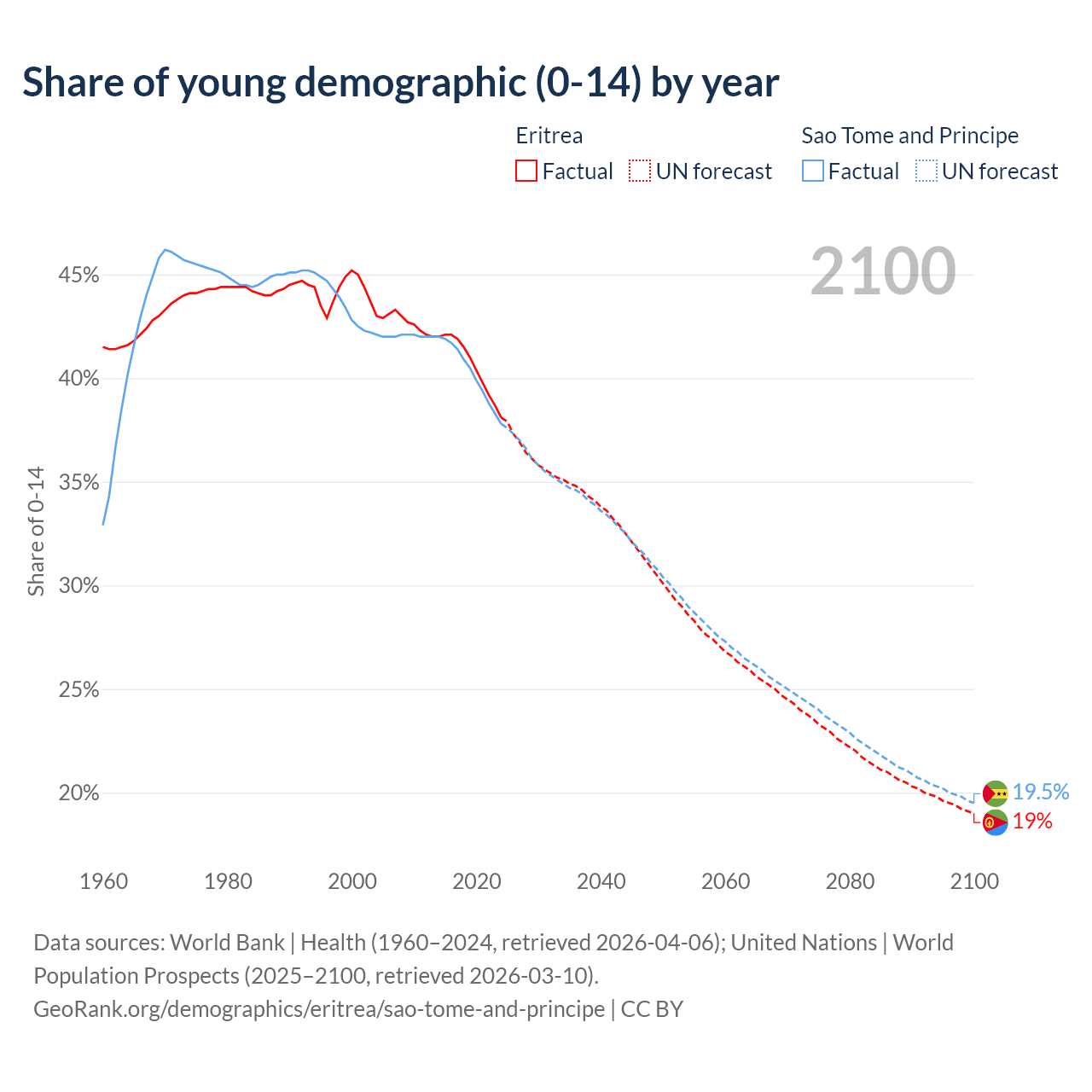 - The share of young demographic (0-15 years old) in Eritrea is 38.1% vs 37.8% in Sao Tome and Principe.