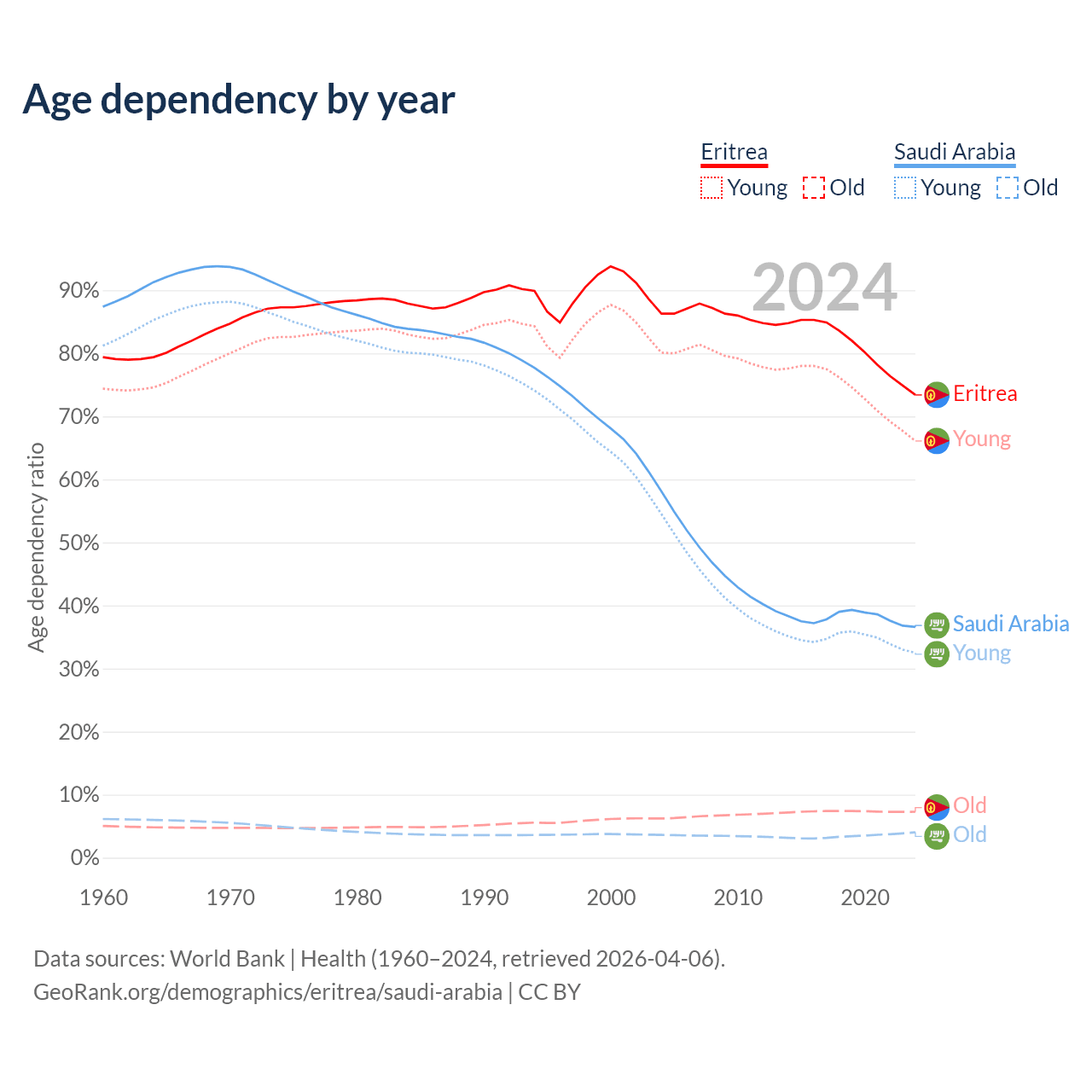- Eritrea is ranked 168/196 by median age (oldest to youngest) vs 98/196 for Saudi Arabia.