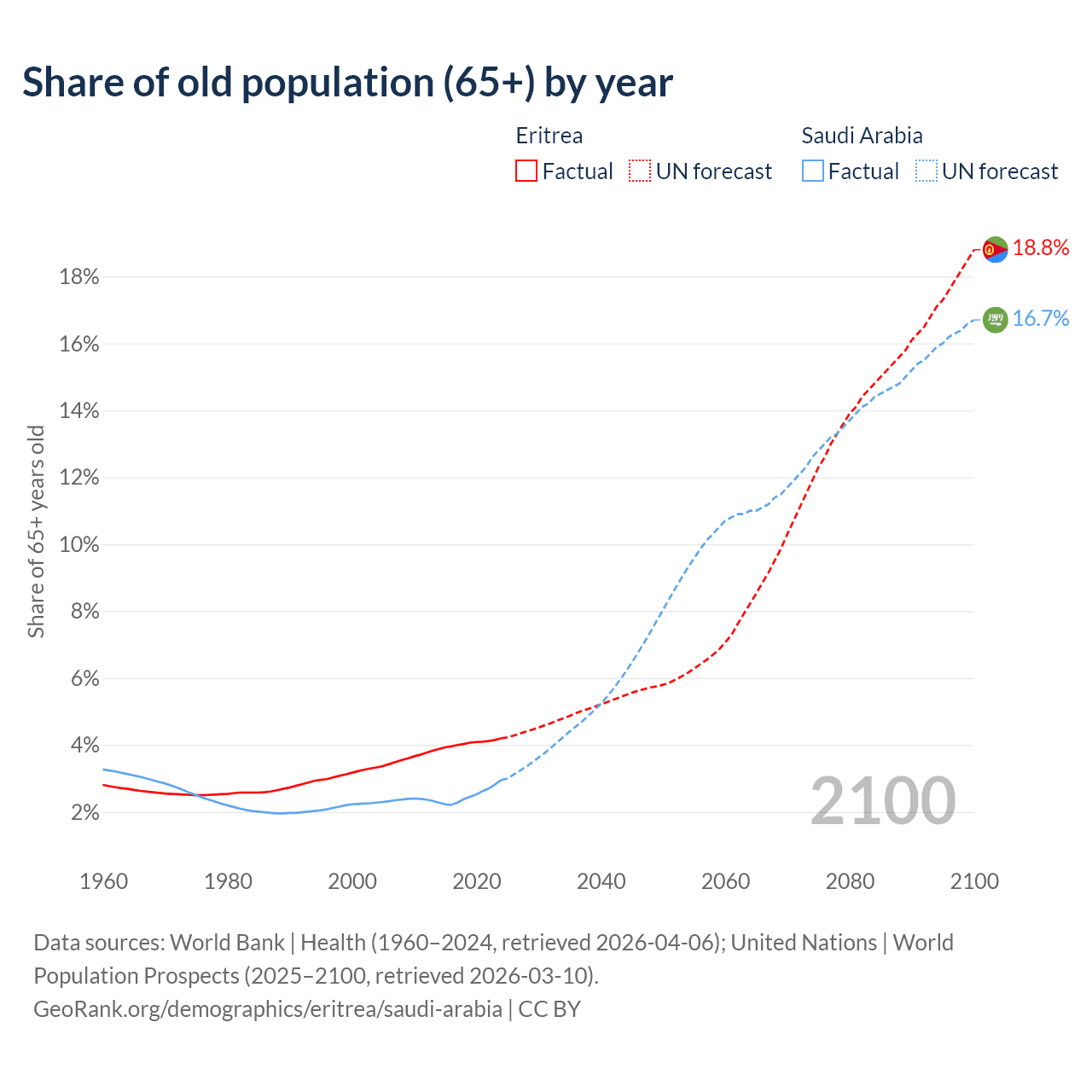The share of older people aged 65 and over is 4.2% in Eritrea and 2.95% in Saudi Arabia. Life expectancy in Eritrea compared to Saudi Arabia .