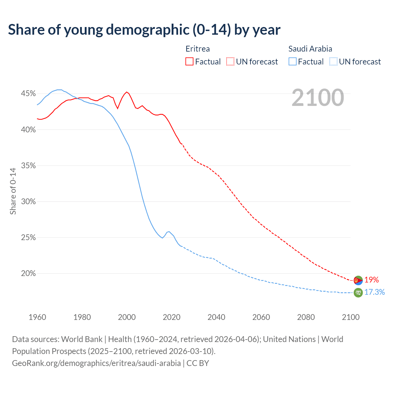 - The share of young demographic (0-15 years old) in Eritrea is 38.1% vs 23.8% in Saudi Arabia.