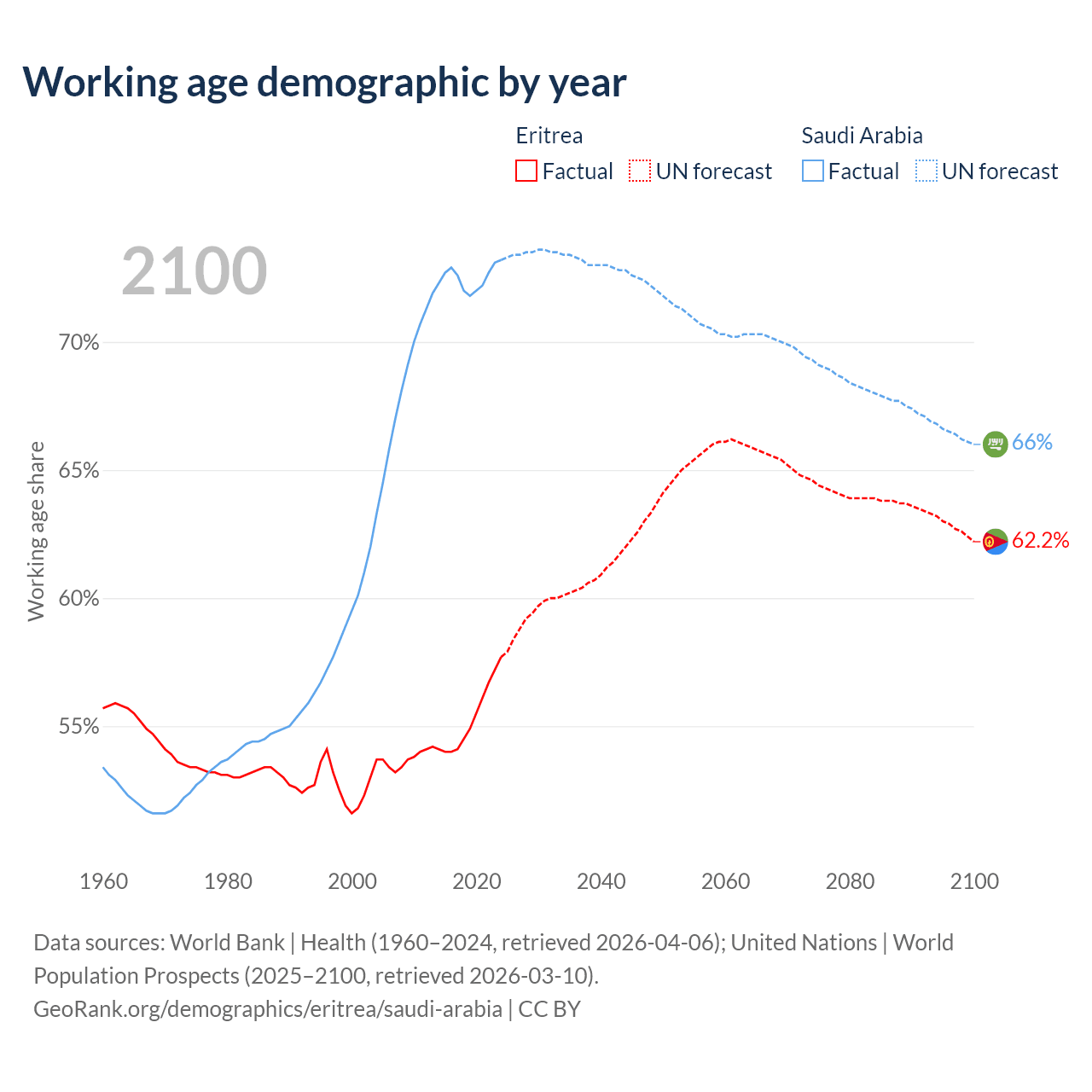 - Eritrea has 2.13M working age adults (aged 15-64) vs 26.9M in Saudi Arabia.
