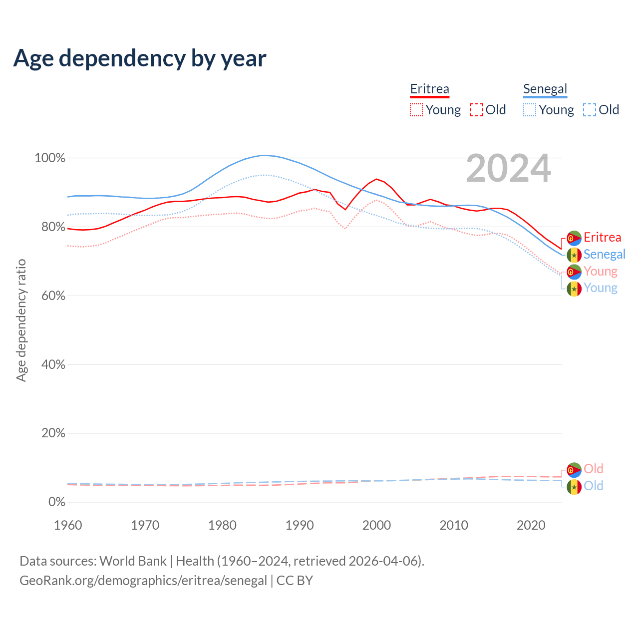 - Eritrea is ranked 168/196 by median age (oldest to youngest) vs 162/196 for Senegal.