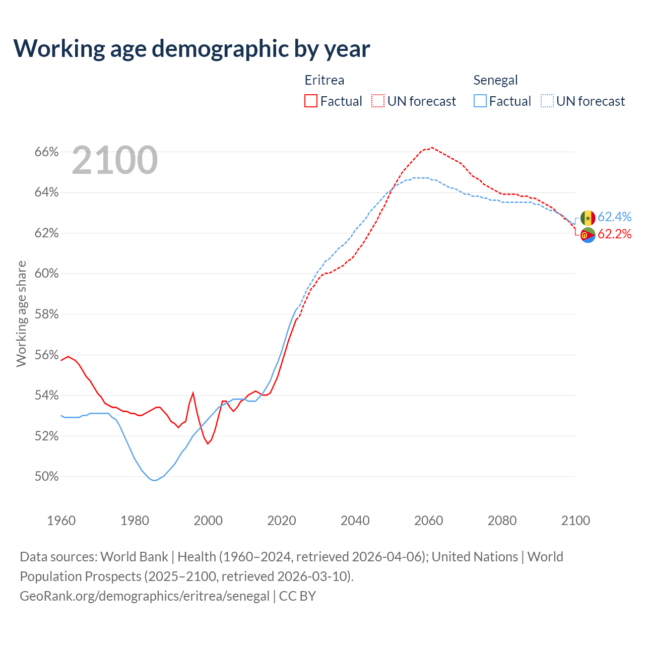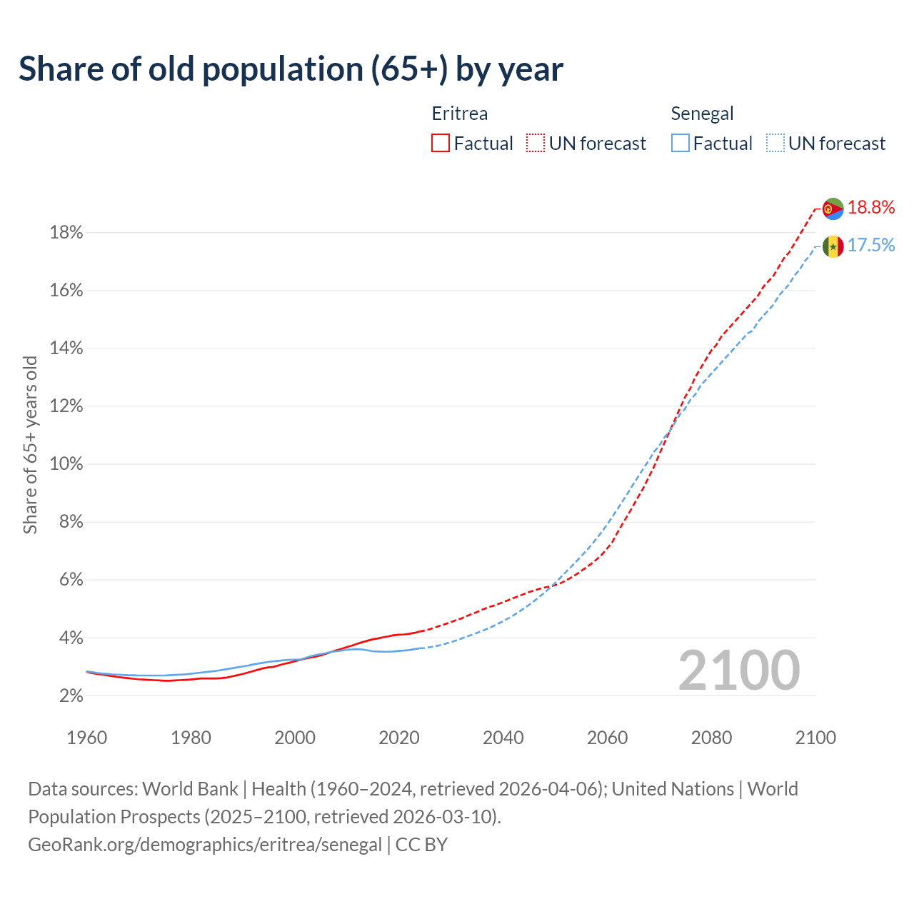 - The share of old-age demographic (65+) in Eritrea is 4.2% vs 3.62% in Senegal.