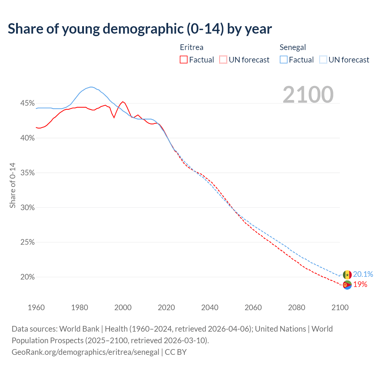 - The share of young demographic (0-15 years old) in Eritrea is 38.1% vs 38.2% in Senegal.