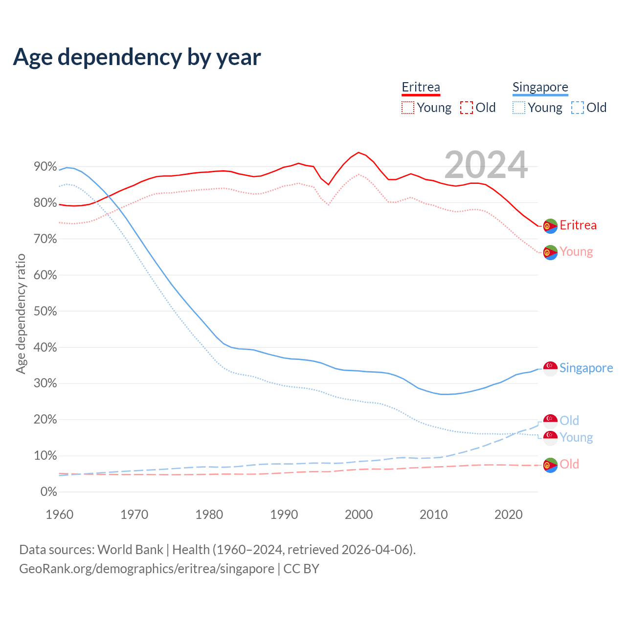 - Eritrea is ranked 168/196 by median age (oldest to youngest) vs 68/196 for Singapore.