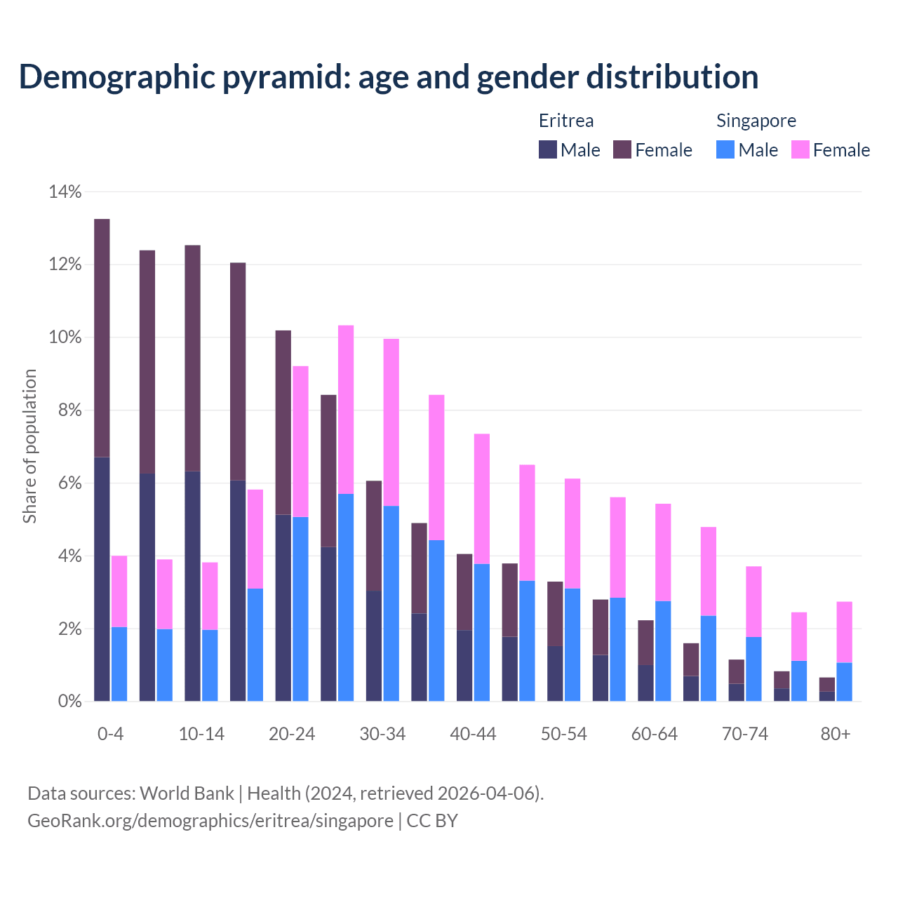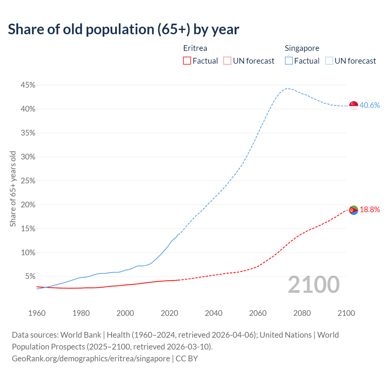 The share of older people aged 65 and over is 4.2% in Eritrea and 13.7% in Singapore. Life expectancy in Eritrea compared to Singapore .