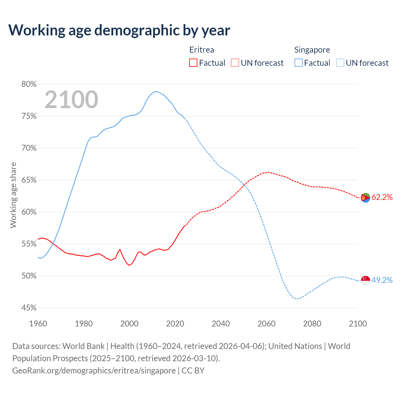Median age Eritrea vs Singapore, 1960-2100
