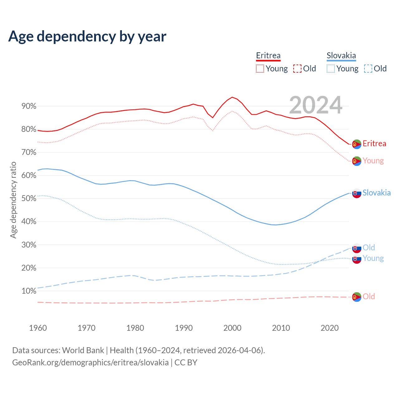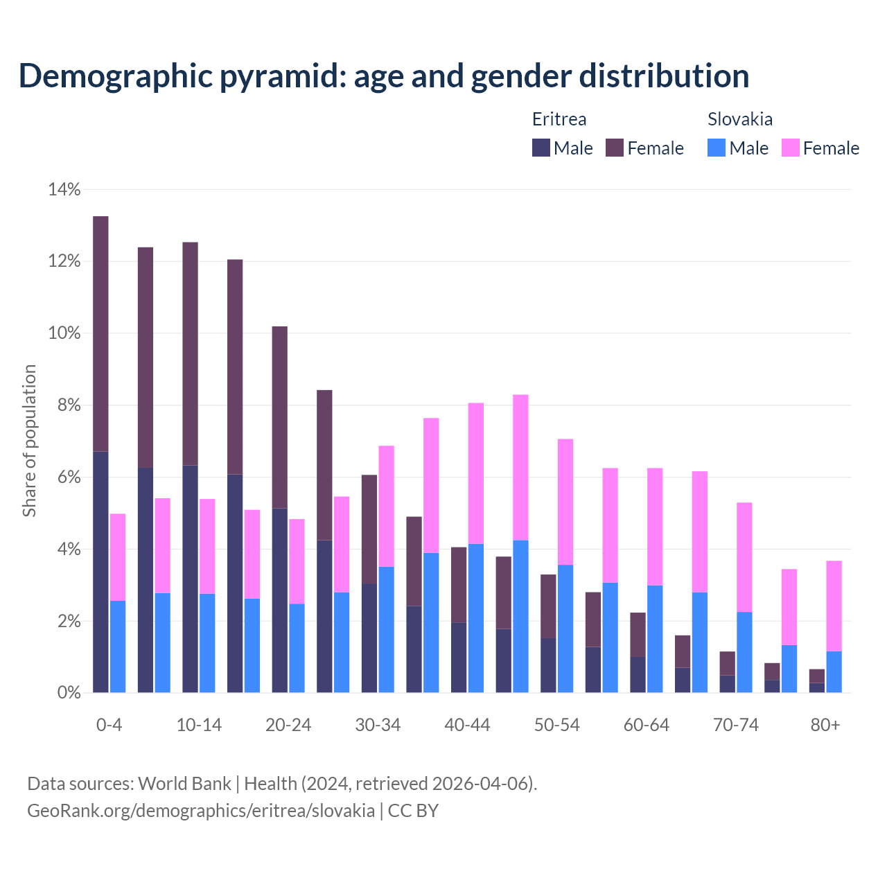 The share of older people aged 65 and over is 4.2% in Eritrea and 18.5% in Slovakia. Life expectancy in Eritrea compared to Slovakia .
