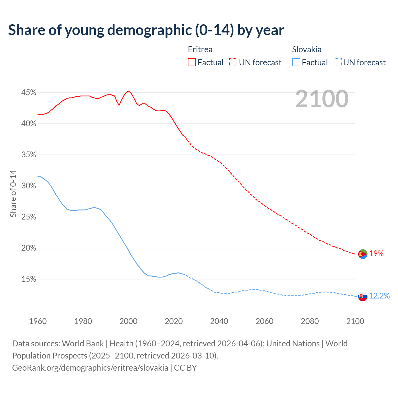 - The share of young demographic (0-15 years old) in Eritrea is 38.1% vs 15.8% in Slovakia.