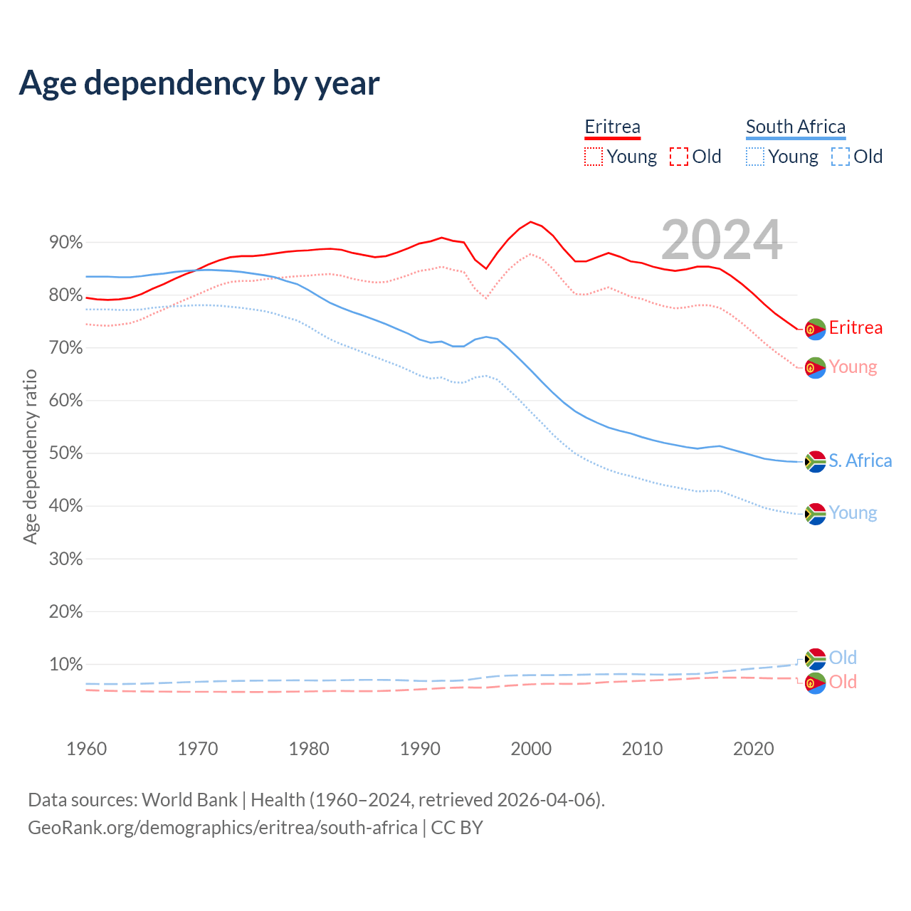 The share of older people aged 65 and over is 4.2% in Eritrea and 6.69% in South Africa. Life expectancy in Eritrea compared to South Africa .