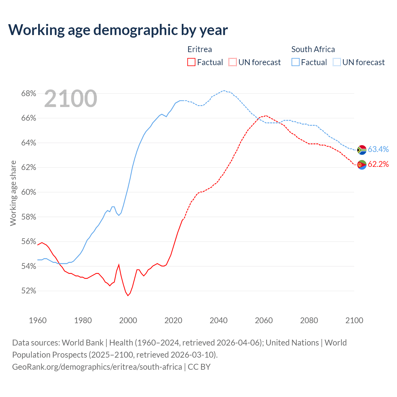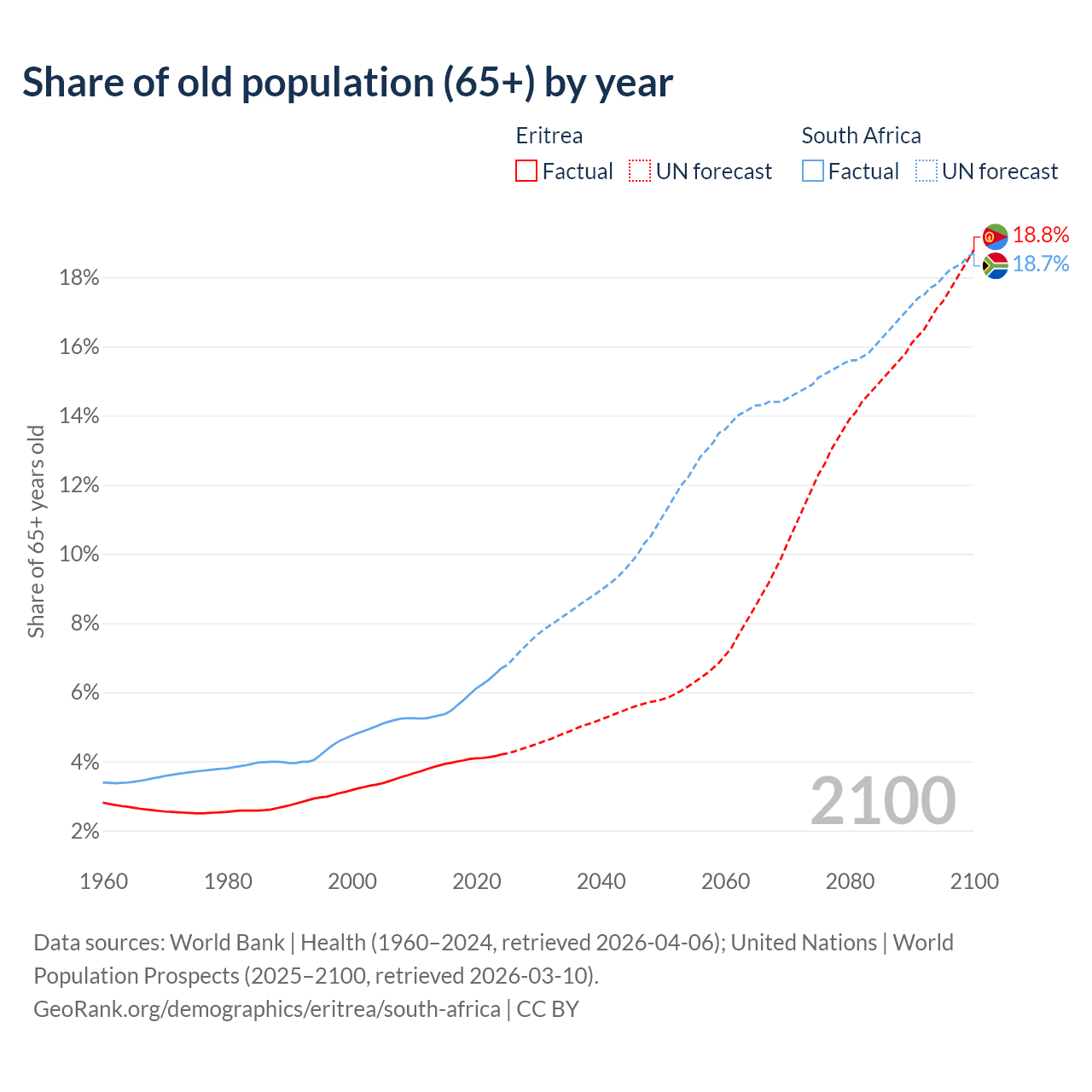 Median age Eritrea vs South Africa, 1960-2100