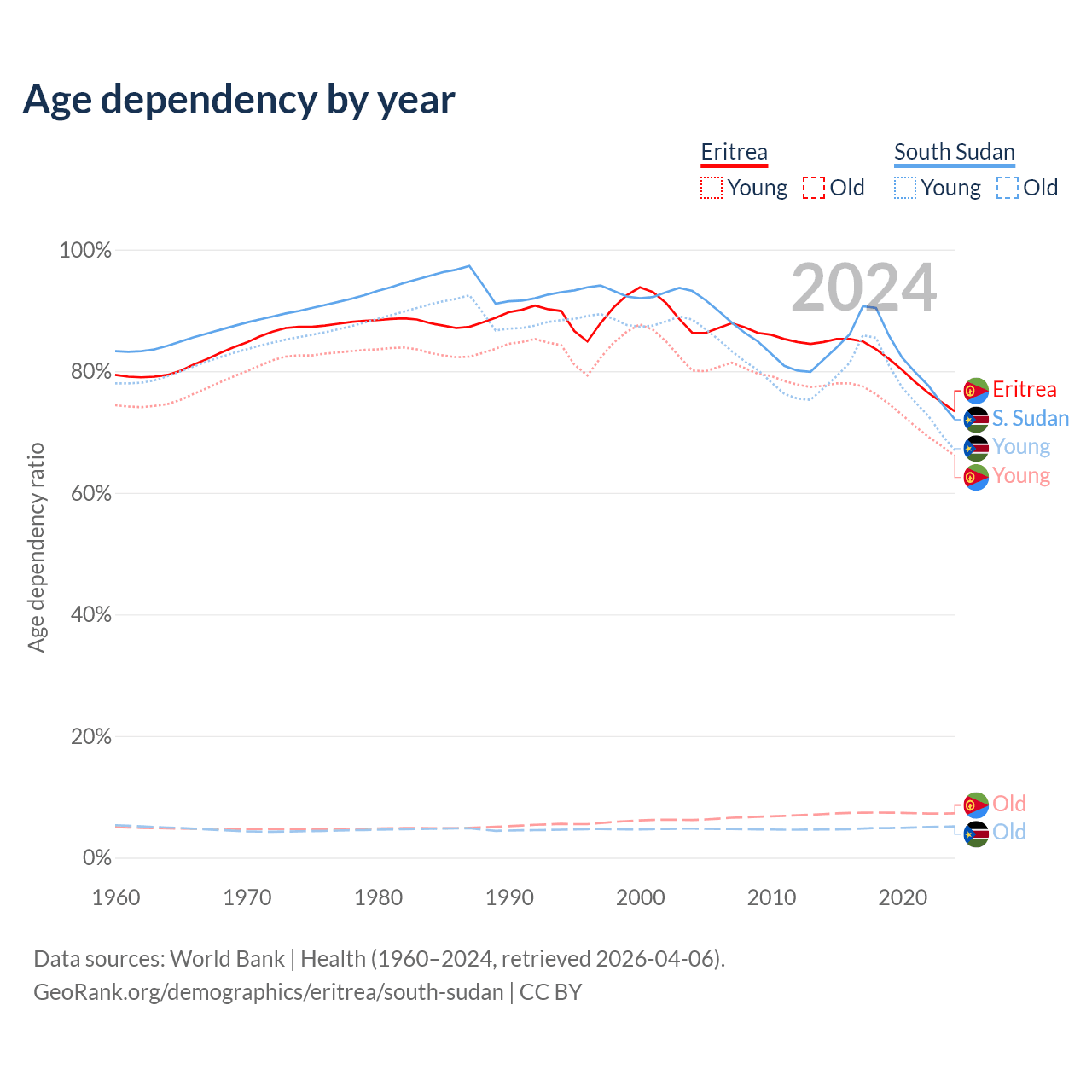 - Eritrea is ranked 168/196 by median age (oldest to youngest) vs 173/196 for South Sudan.