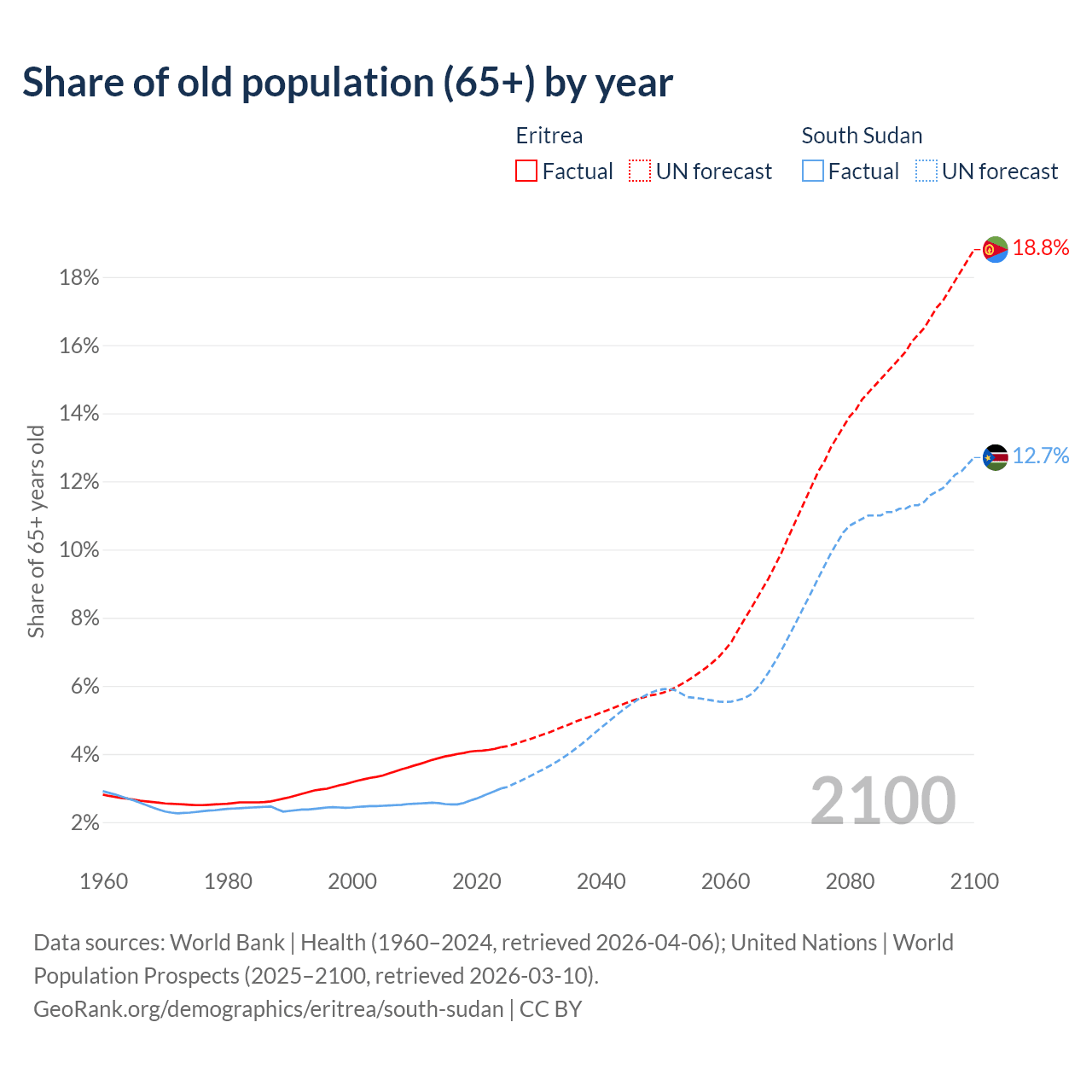 The share of older people aged 65 and over is 4.2% in Eritrea and 2.99% in South Sudan. Life expectancy in Eritrea compared to South Sudan .