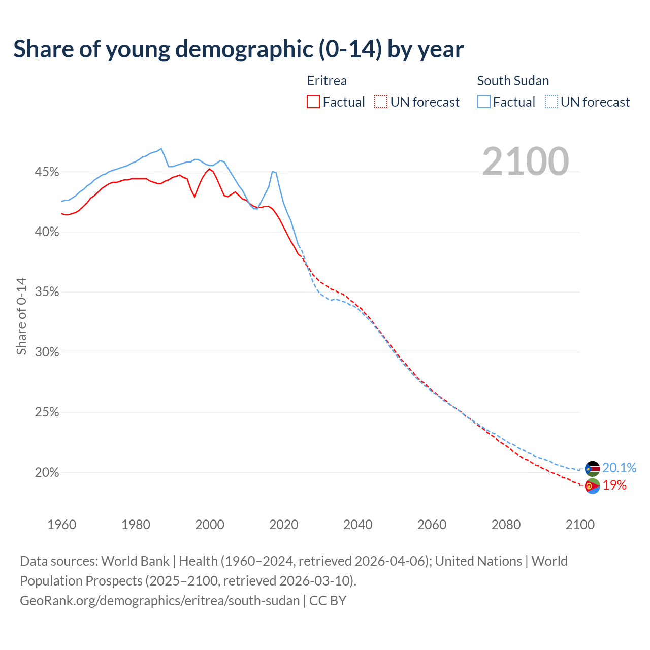 - The share of young demographic (0-15 years old) in Eritrea is 38.1% vs 38.9% in South Sudan.