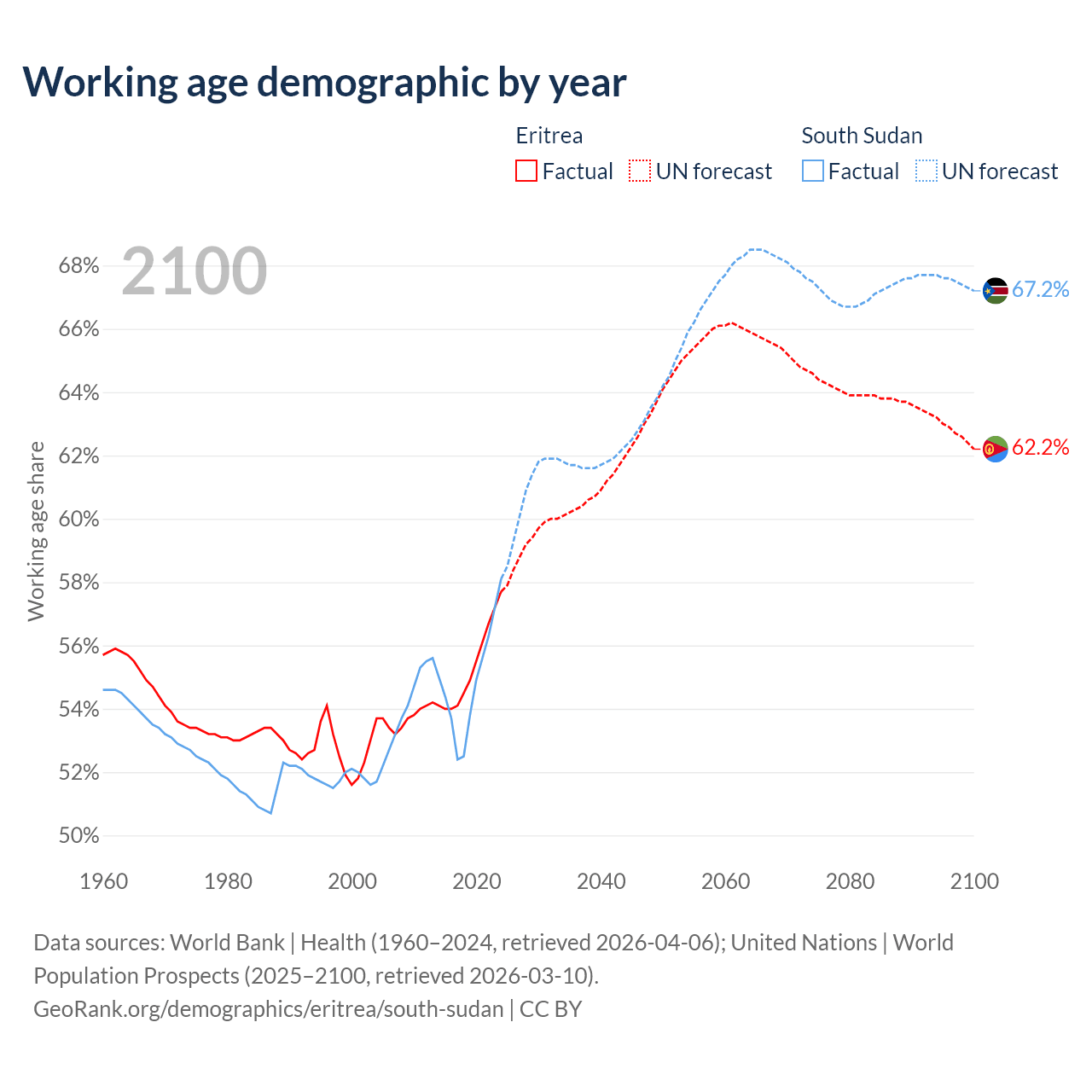 - Eritrea has 2.13M working age adults (aged 15-64) vs 7.27M in South Sudan.