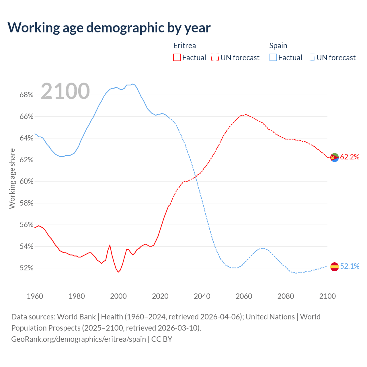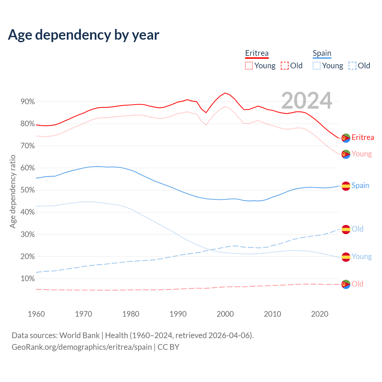 The share of older people aged 65 and over is 4.2% in Eritrea and 21.1% in Spain. Life expectancy in Eritrea compared to Spain .