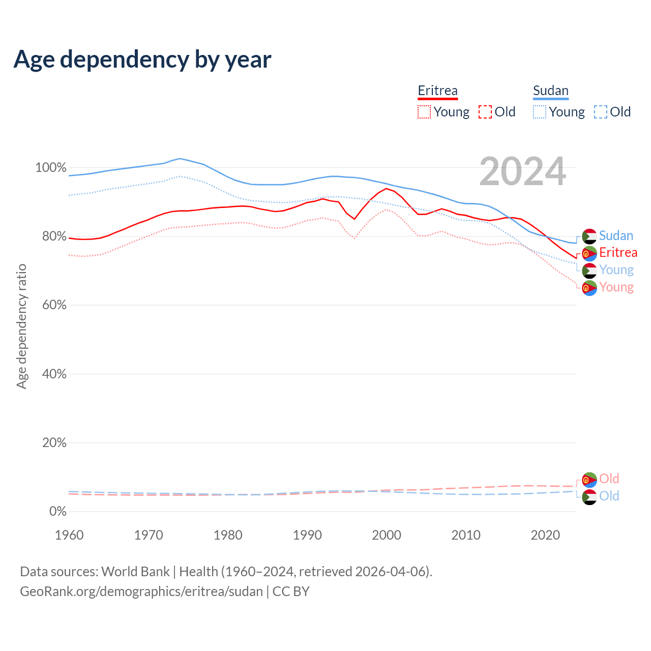 - Eritrea is ranked 168/196 by median age (oldest to youngest) vs 172/196 for Sudan.