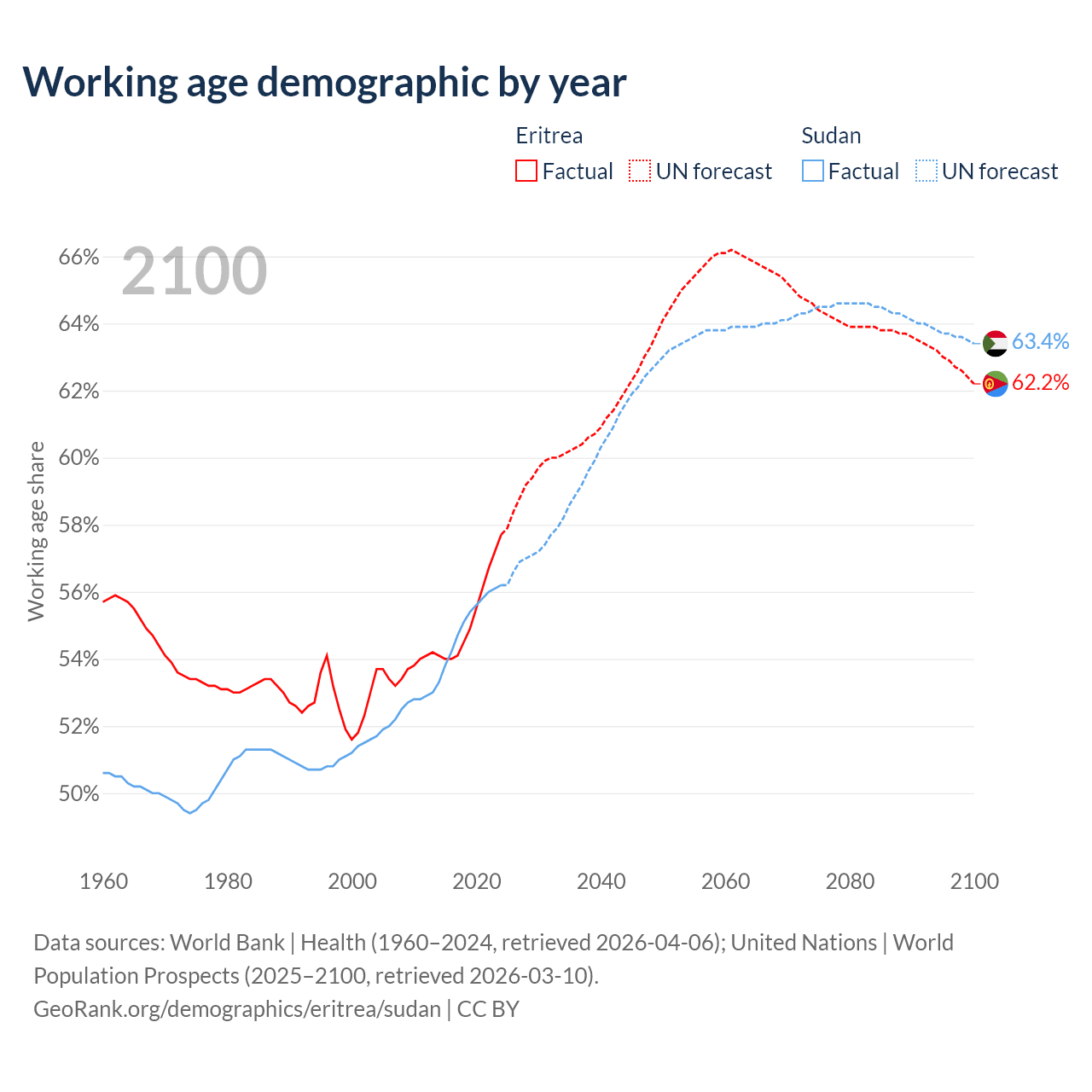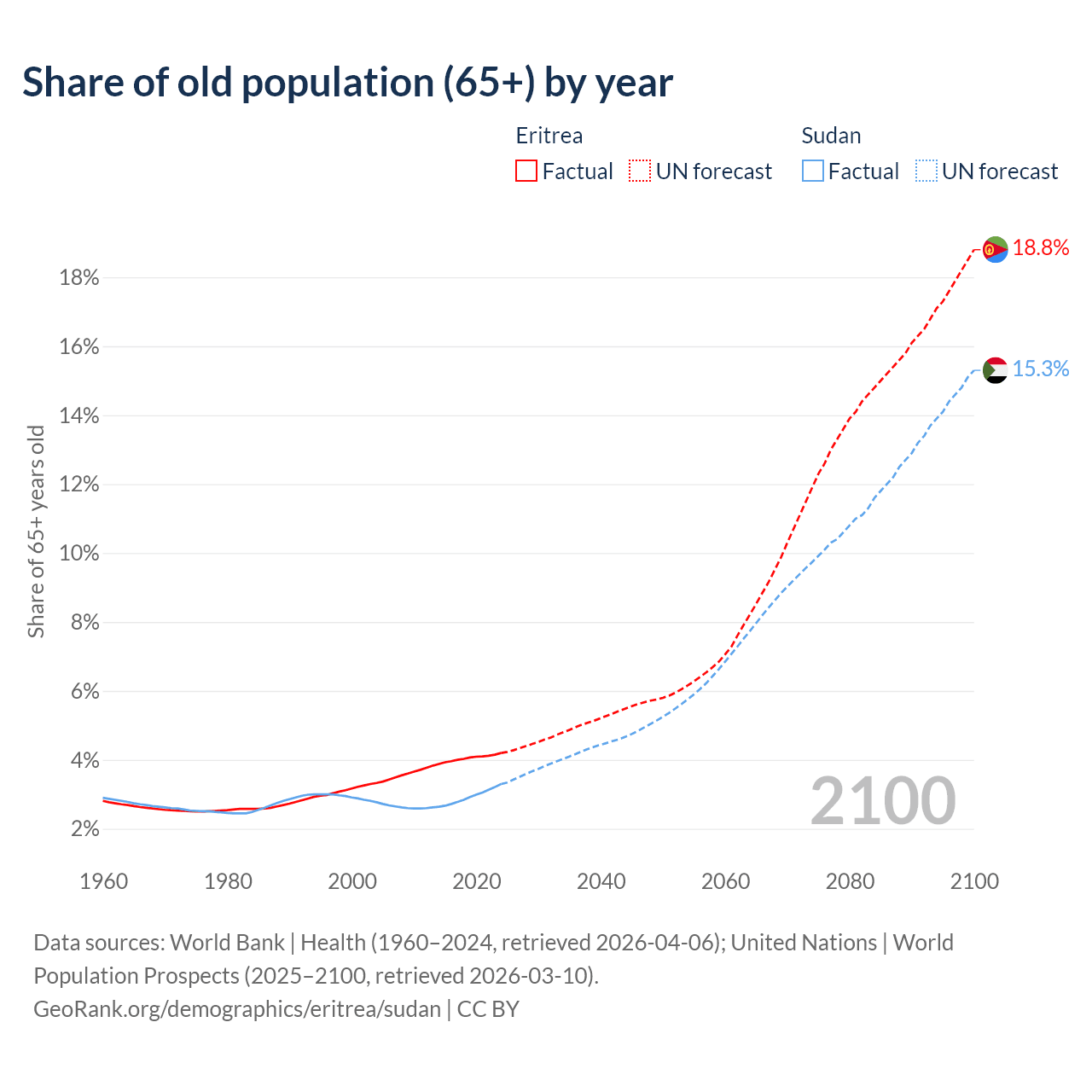 The share of older people aged 65 and over is 4.2% in Eritrea and 3.3% in Sudan. Life expectancy in Eritrea compared to Sudan .