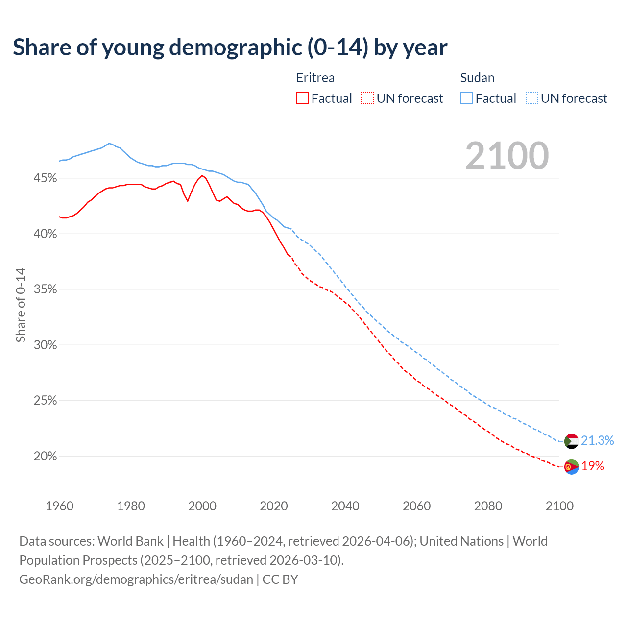 - The share of young demographic (0-15 years old) in Eritrea is 38.1% vs 40.5% in Sudan.