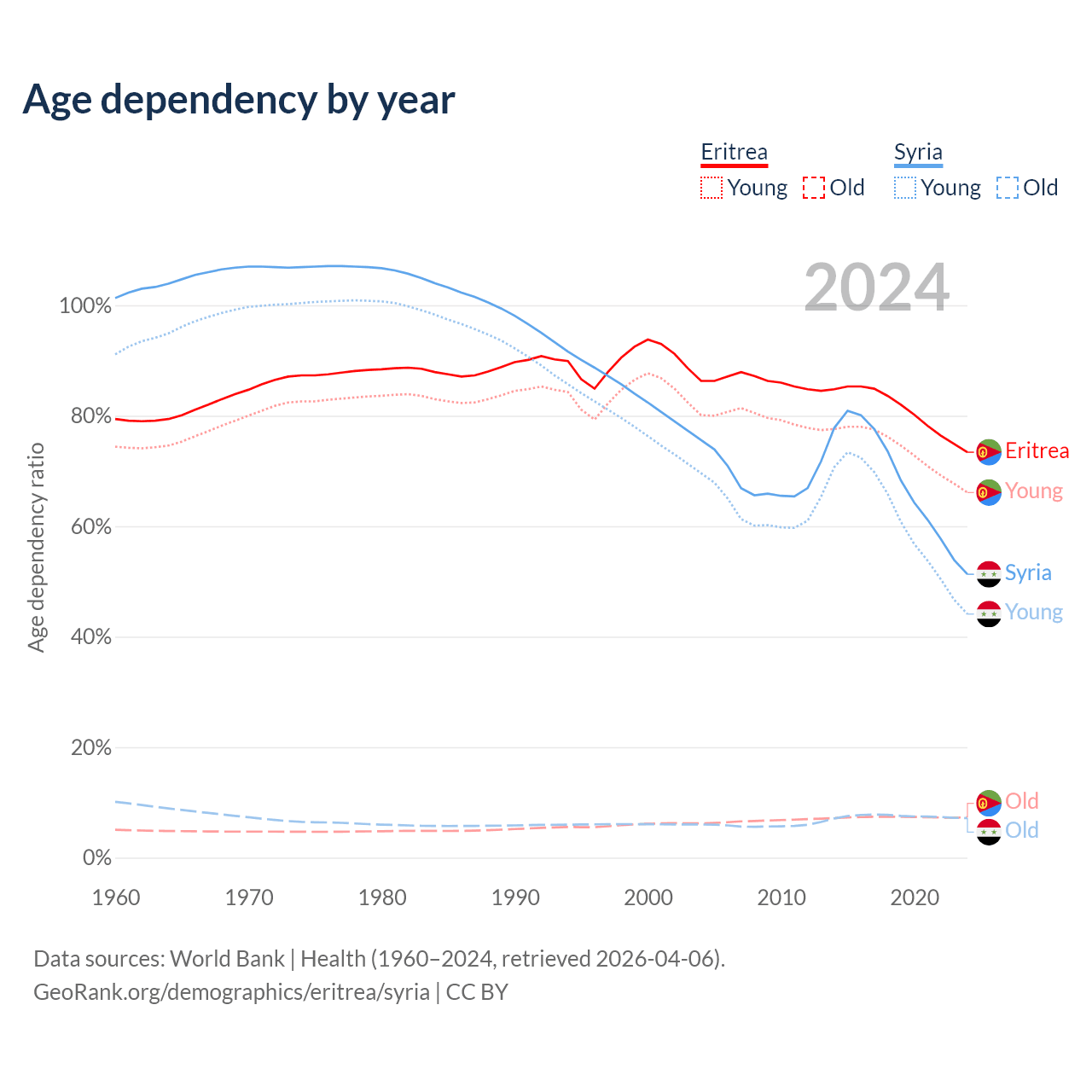- The share of old-age demographic (65+) in Eritrea is 4.2% vs 4.74% in Syria.