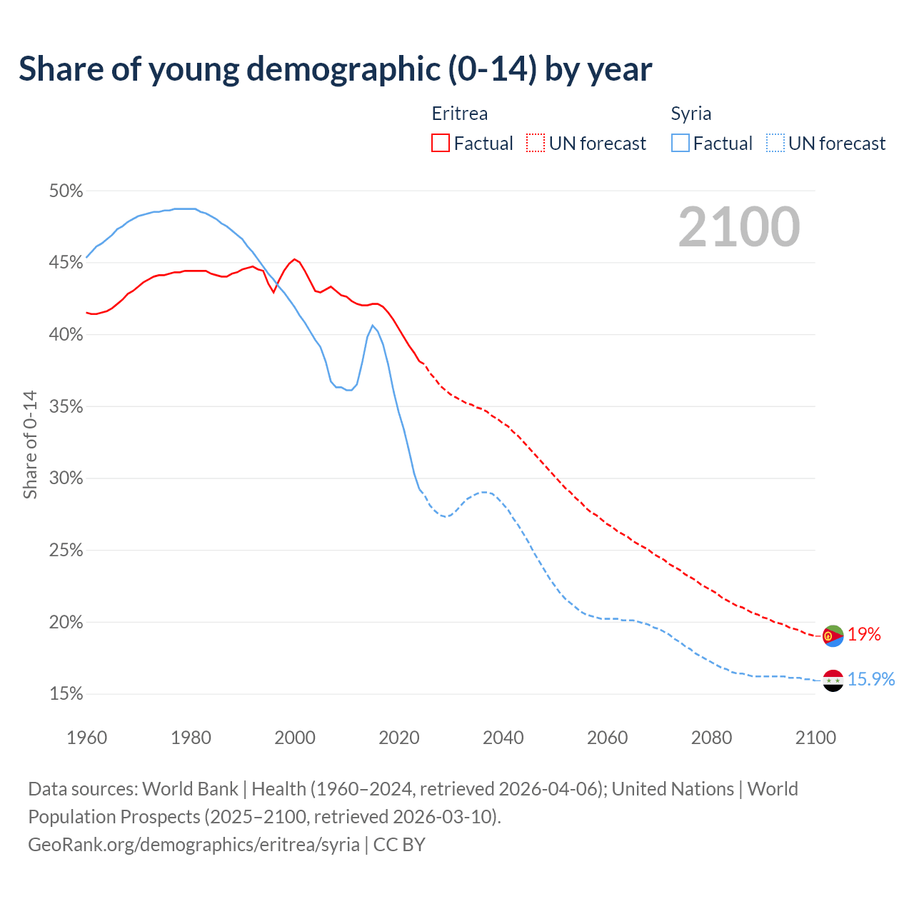 - The share of young demographic (0-15 years old) in Eritrea is 38.1% vs 29.2% in Syria.