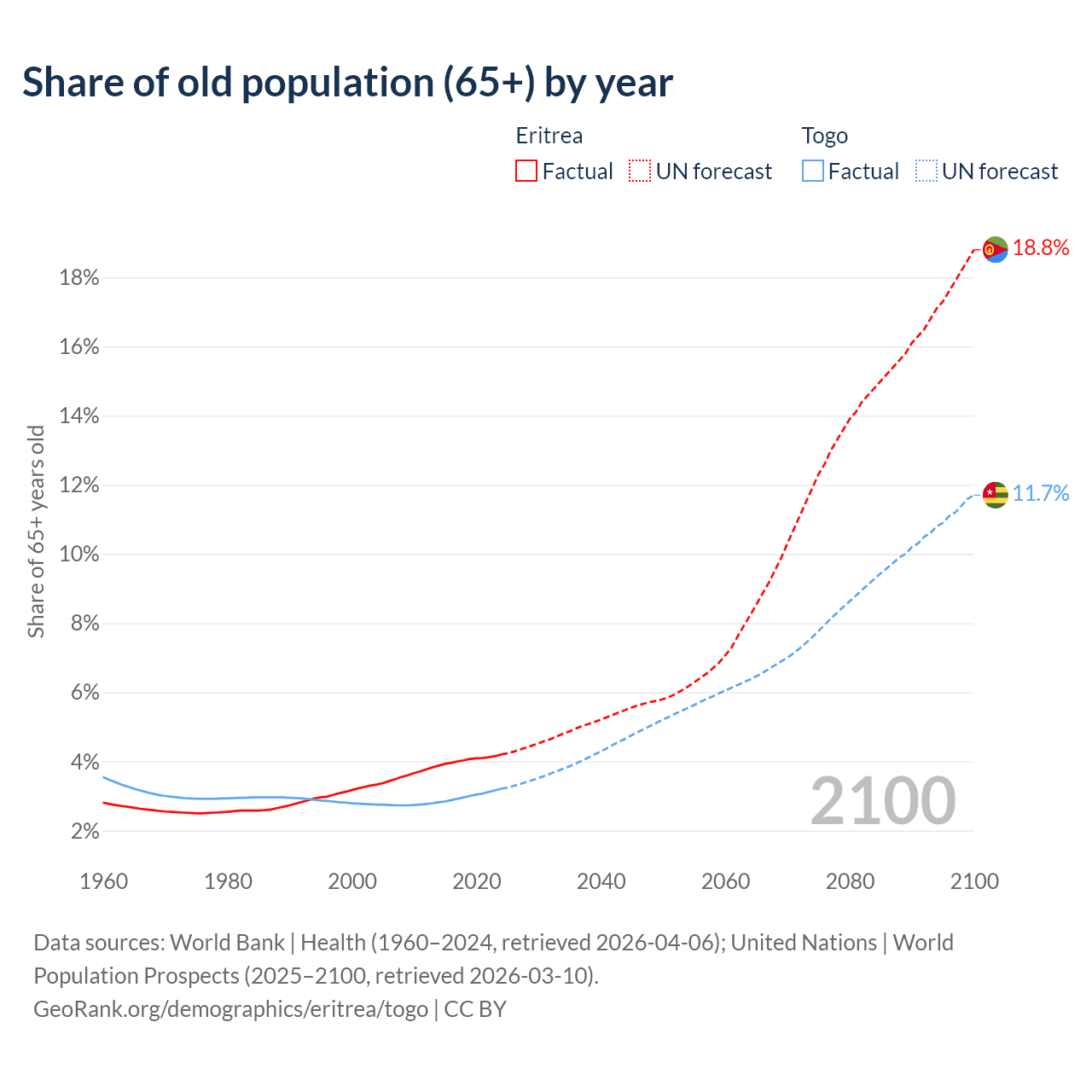 The share of older people aged 65 and over is 4.2% in Eritrea and 3.21% in Togo. Life expectancy in Eritrea compared to Togo .