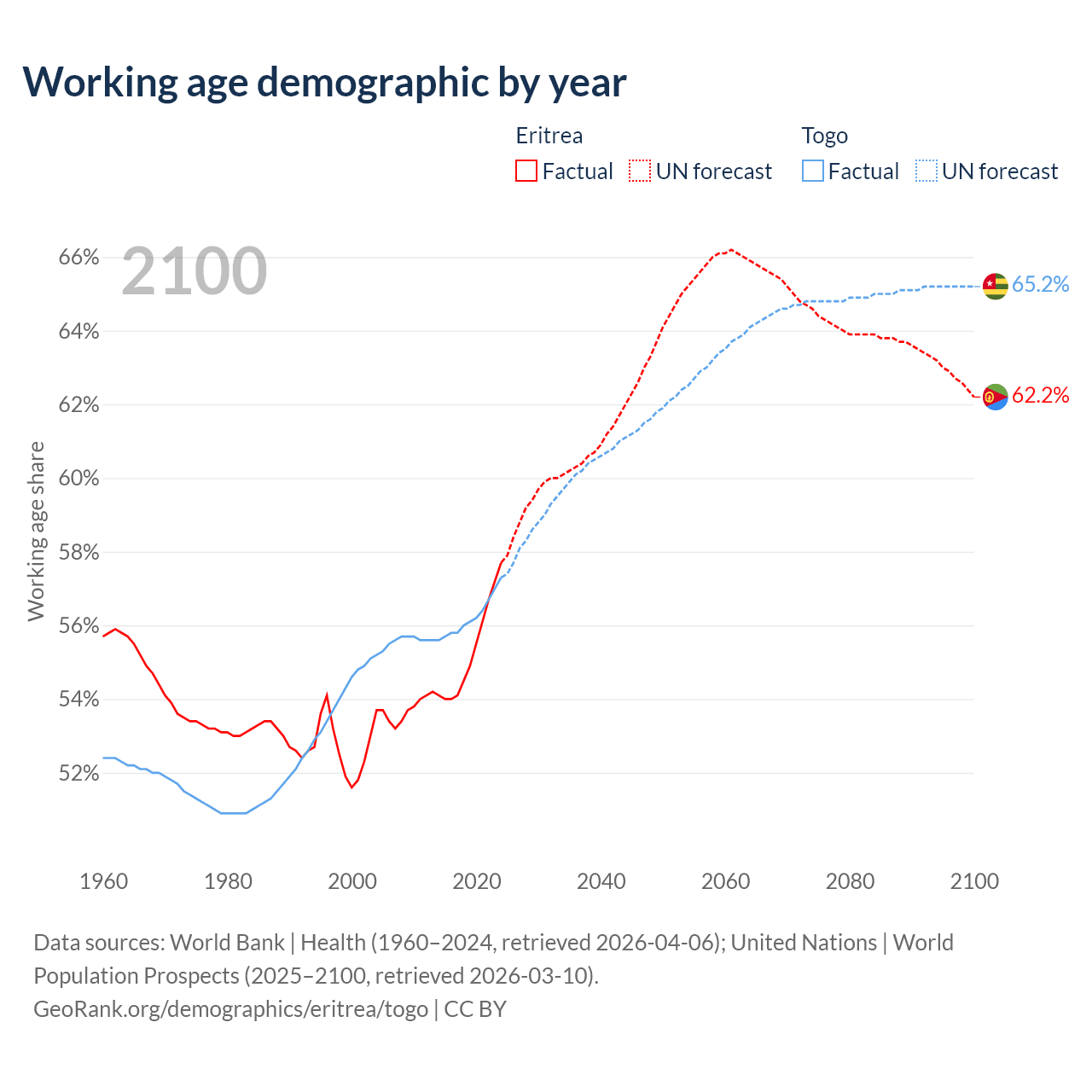 - Eritrea has 2.13M working age adults (aged 15-64) vs 5.72M in Togo.