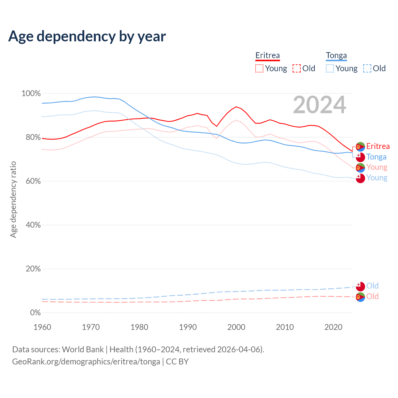 The share of older people aged 65 and over is 4.2% in Eritrea and 6.72% in Tonga. Life expectancy in Eritrea compared to Tonga .