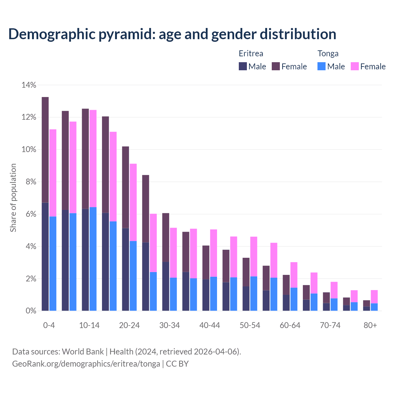 - As of 2026, the population of Eritrea is 3.7M vs 103K in Tonga - 35.8 times difference.