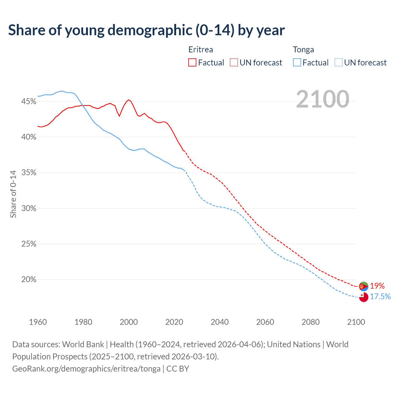 - The share of young demographic (0-15 years old) in Eritrea is 38.1% vs 35.4% in Tonga.