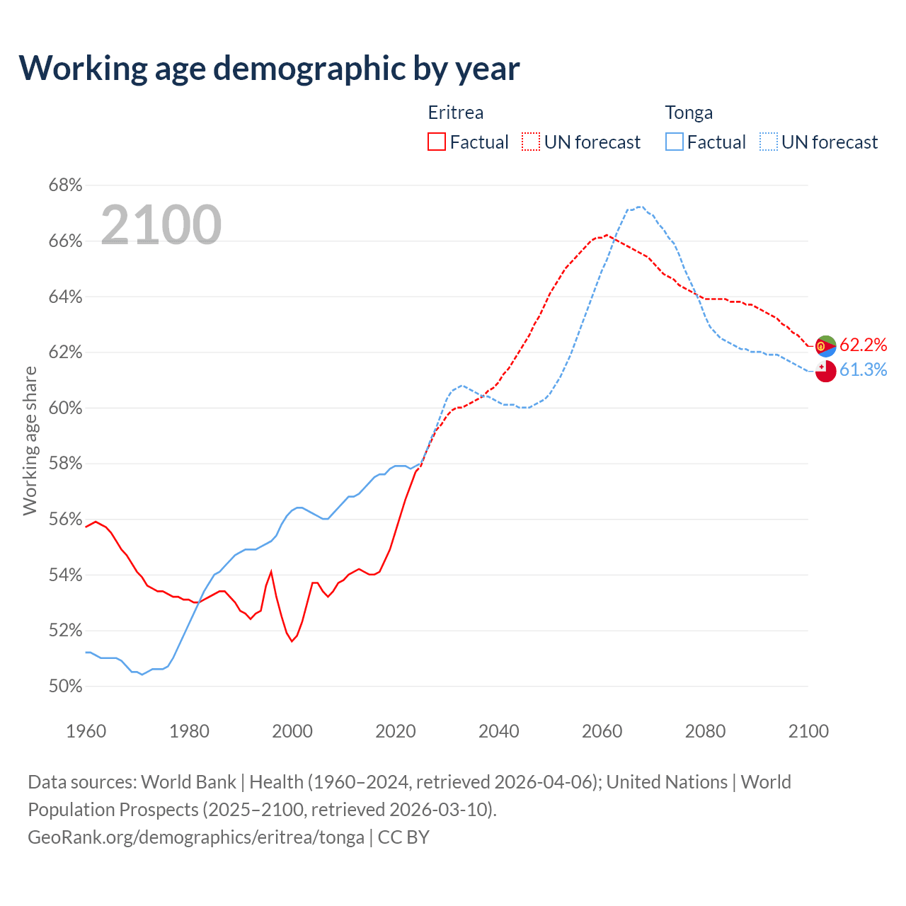 - Eritrea has 2.13M working age adults (aged 15-64) vs 59.8K in Tonga.