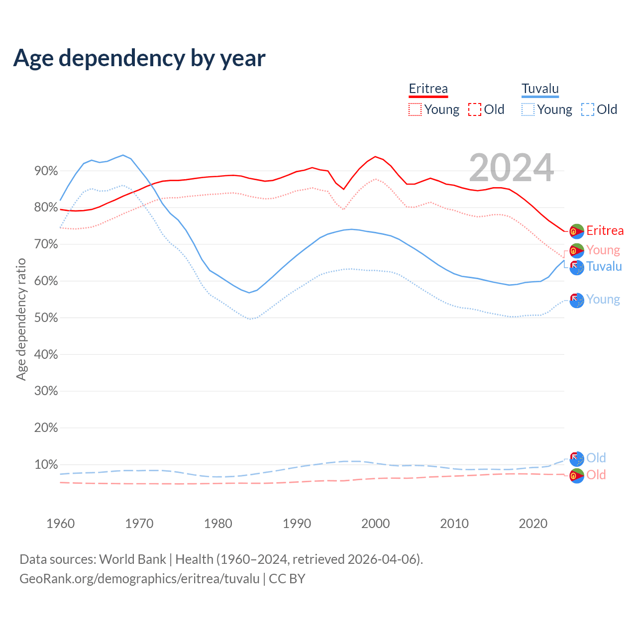 - Eritrea is ranked 168/196 by median age (oldest to youngest) vs 132/196 for Tuvalu.
