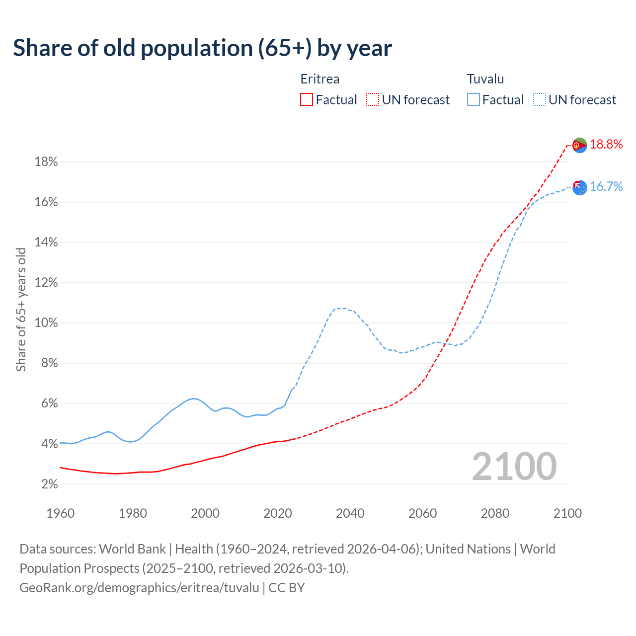 The share of older people aged 65 and over is 4.2% in Eritrea and 6.67% in Tuvalu. Life expectancy in Eritrea compared to Tuvalu .