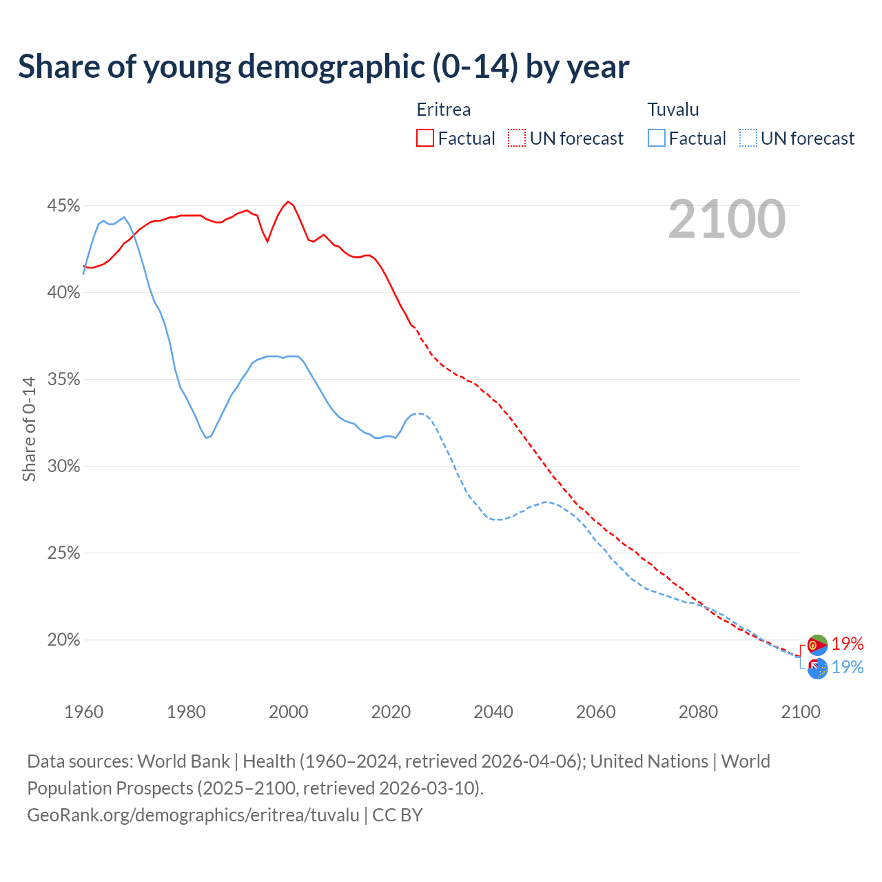 - The share of young demographic (0-15 years old) in Eritrea is 38.1% vs 32.9% in Tuvalu.