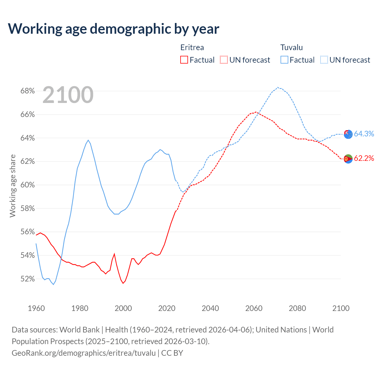 - Eritrea has 2.13M working age adults (aged 15-64) vs 5.64K in Tuvalu.