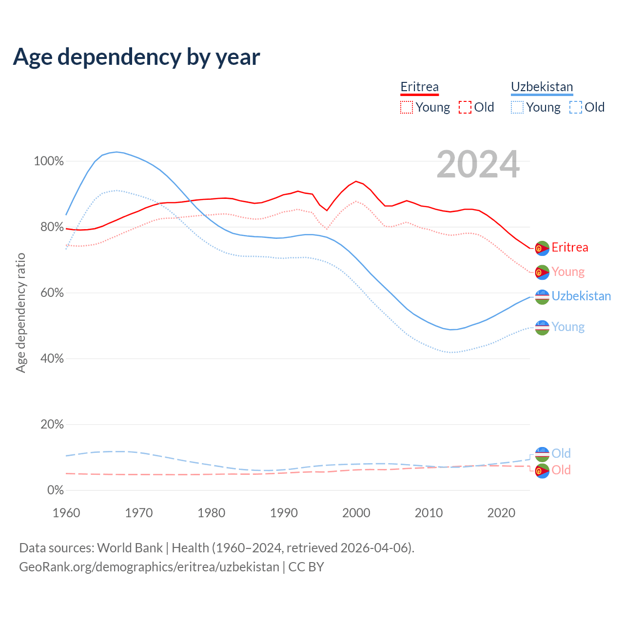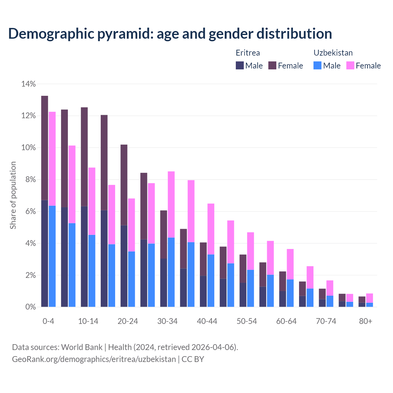 - Eritrea is ranked 168/196 by median age (oldest to youngest) vs 116/196 for Uzbekistan.